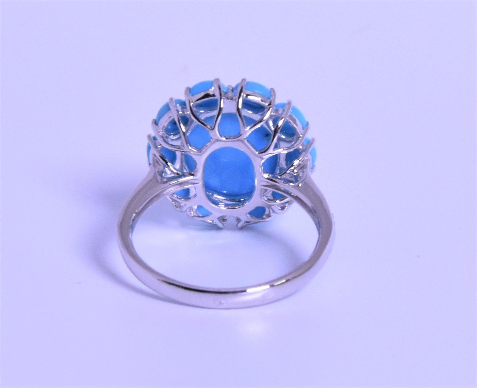 Bague ovale or blanc 18 K (750/oo), sertie en son centre d'une turquoise taille cabochon entourée de 10 turquoises taille cabochon, 5,95 cts environ, épaulées de 10 diamants blancs taille moderne 0,10 ct, TDD : 55. Poids brut : 4.4 g environ.