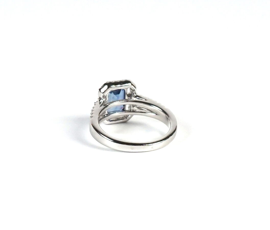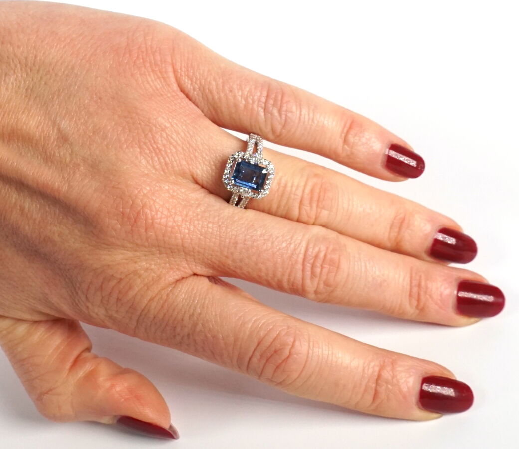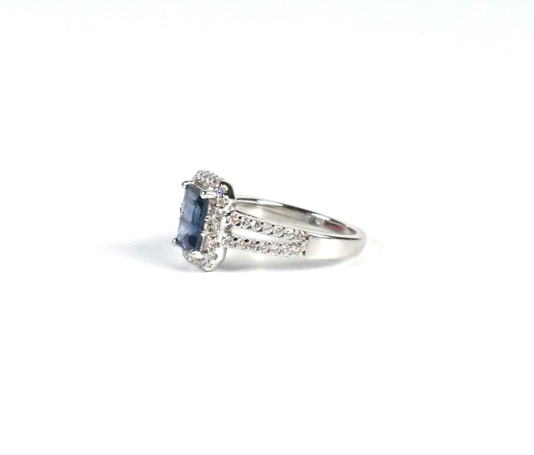 Bague rectangulaire en or gris 18K (750/oo), ornée au centre d'un saphir taille émeraude pesant 1.75 carat, agrémenté de 52 diamants blancs taille moderne pour 0.55 carat. TDD 54. Poids brut : 6.65 g environ.