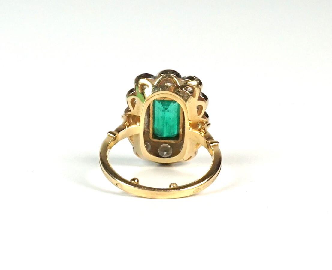 Bague rectangulaire festonnée, en or de 2 tons 18 K (750/oo), sertie au centre d'une émeraude taille émeraude calibrant 1.2 cts environ, dans un entourage de 12 diamants ronds taille moderne pesant ensemble 1 ct environ. TDD 51 (avec rétrécisseur boules). Poids brut : 6.7 g environ.