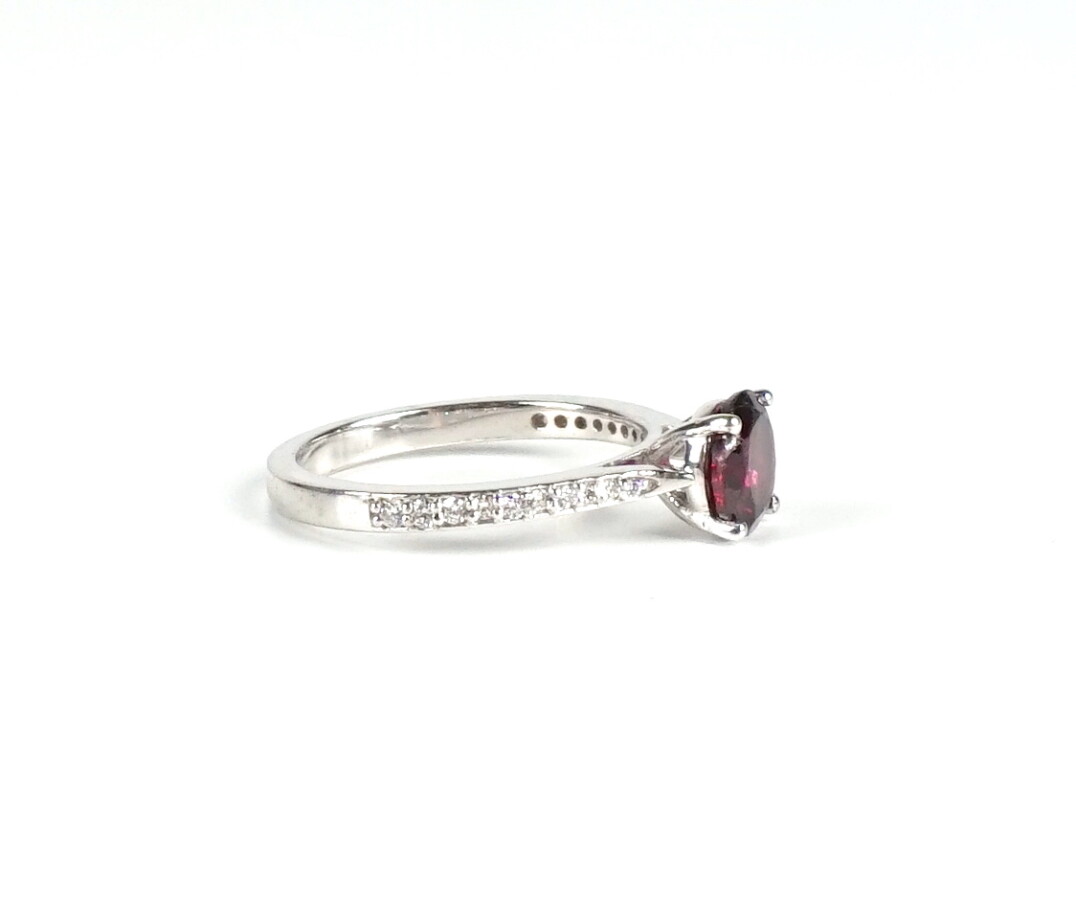 Bague ronde en argent (925/oo), agrémentée d'une rhodochrosite pourpre (7 mm) et de pierres imitant le diamant. TTD 55. Poids brut : 2.79 g environ.