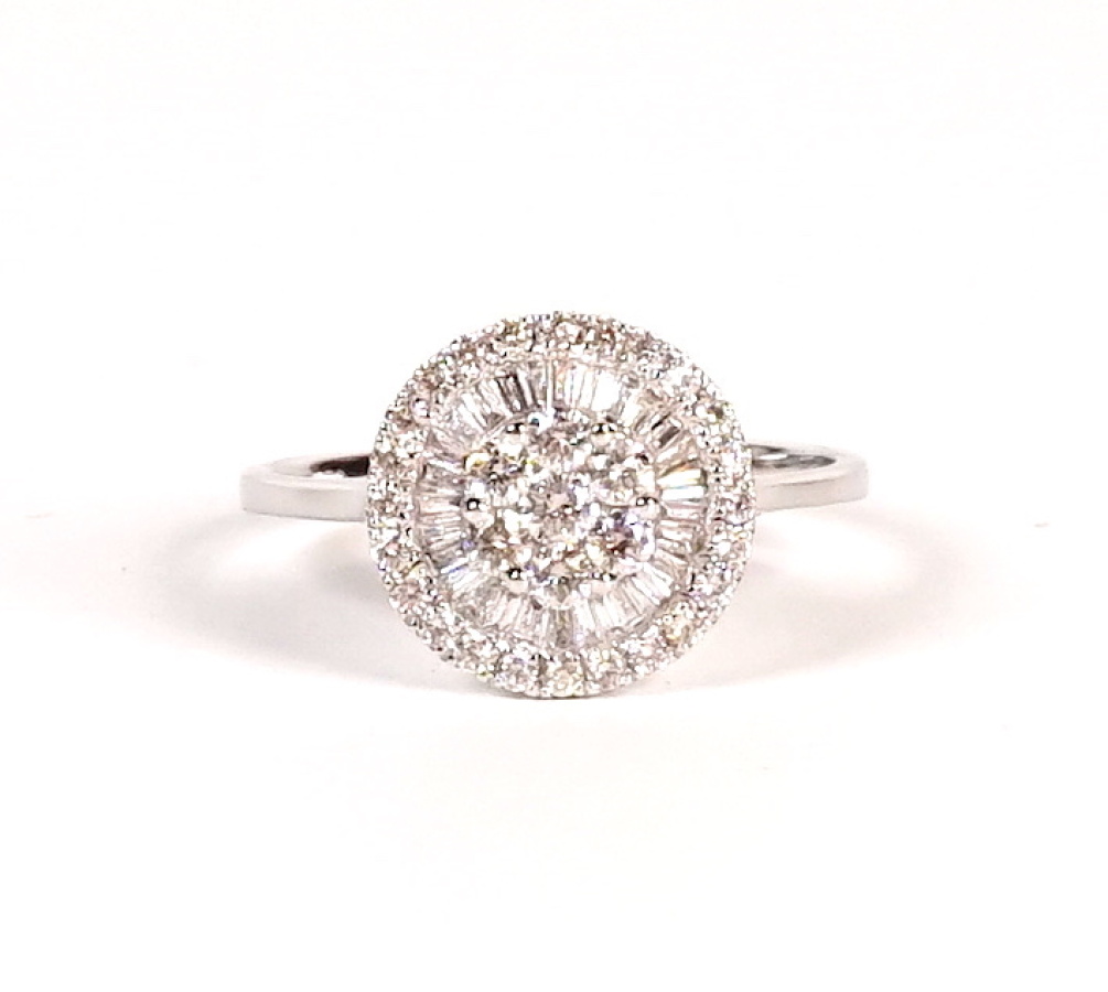Bague ronde en or blanc 18 K (750/oo) sertie de 31 diamants blancs taille moderne 0.35 ct intercalés d'une ligne de 28 diamants blancs taille baguette 0.1 ct. TDD 53. Poids brut : 2.1 g environ.