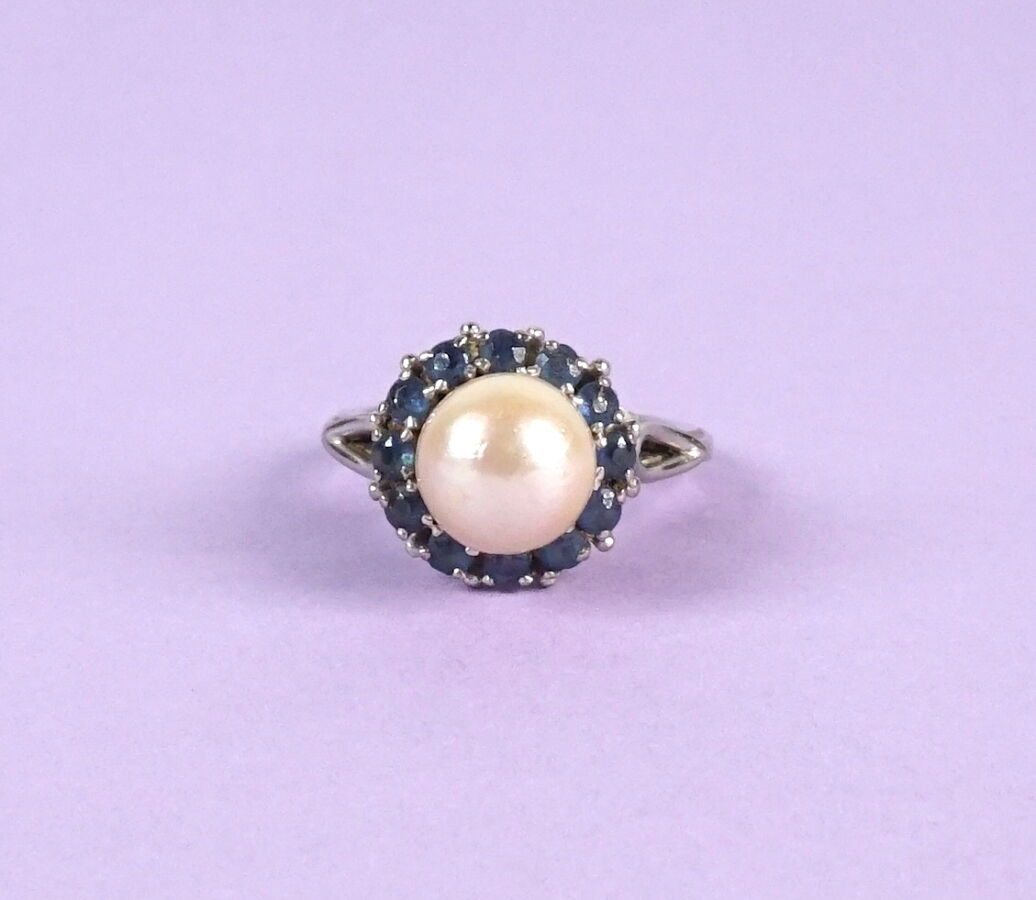 Bague ronde en or gris 18K (750/oo), sertie d'une perle 8-9 mm, entourée de petites pierres bleues taille ronde, probablement des saphirs (petites égrisures). TDD 51.5. Poids brut : 7.8 g environ.