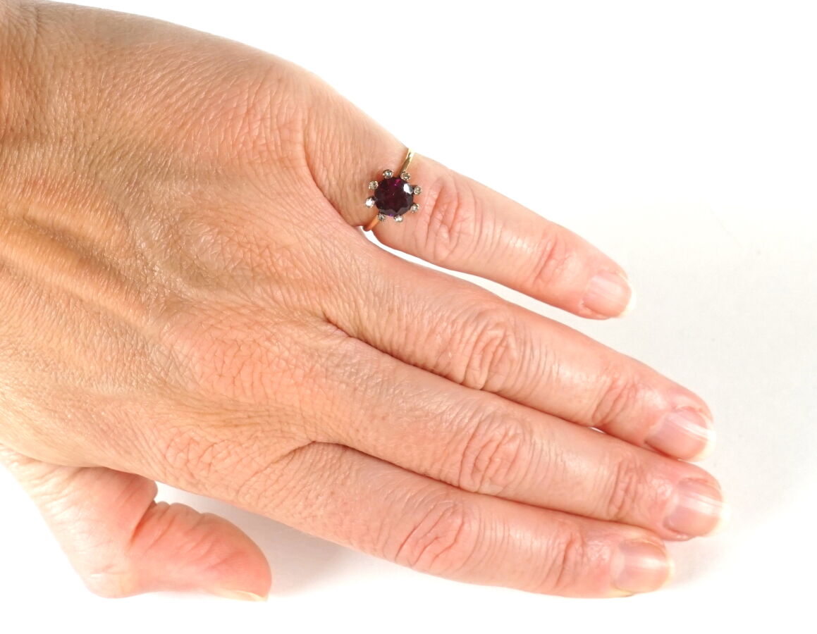 Bague ronde en or jaune 18K (750/oo) sertie d'une pierre ronde rouge-rose, probablement un grenat, dans un entourage de petits diamants taille rose. TDD 49. Poids brut : 1.9 g environ.