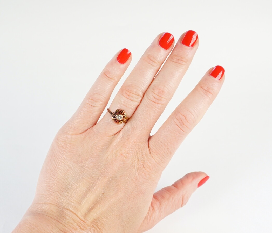 Bague ronde en or jaune 18K (750/oo) surmontée d'un petit dôme ajouré agrémenté au centre d'un petit diamant taille moderne serti clos (manque, accident et restauration au niveau de la monture). TDD 52. Poids brut : 2.7 g environ.