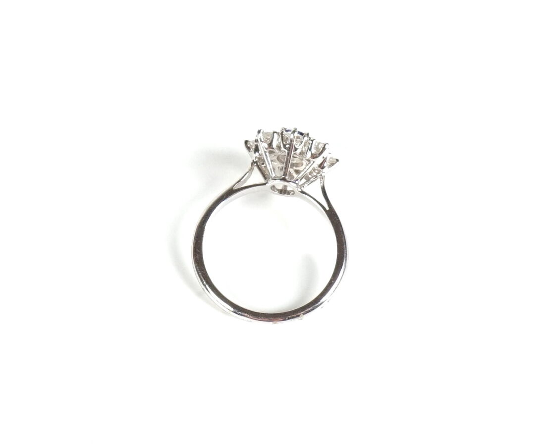 Bague "Rosace" en or gris 18K (750/oo), sertie au centre d'une pierre bleue taille ronde, probablement un saphir, entouré de 8 petits diamants ronds taille moderne calibrant 0.05 carat chaque environ. TDD 52. Poids brut : 3.3 g environ.
