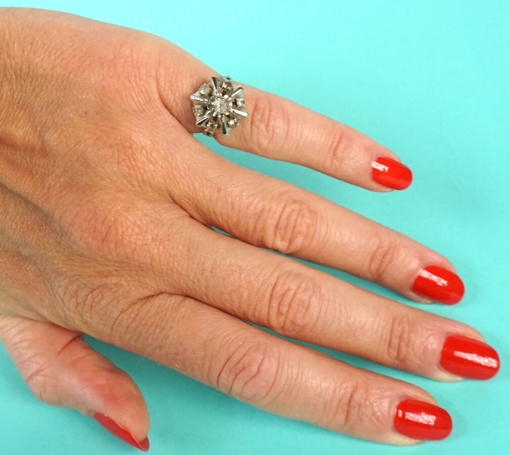 Bague "Rosace" en or gris 18K (750/oo), sertie de pierres imitant le diamant. TDD 48. Poids brut : 3.4 g environ.