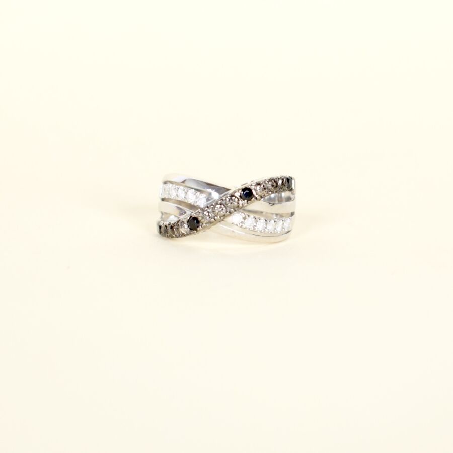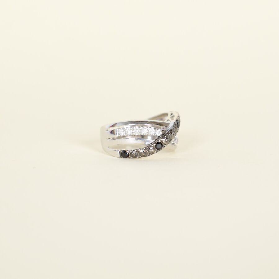 Bague "Ruban croisé" en or blanc 9K (375/oo), les brins pavés de diamants blancs pour 0.2 ct environ et de diamants noirs pour 0.09 ct environ, TDD : 54. Poids brut : 3.5 g environ.