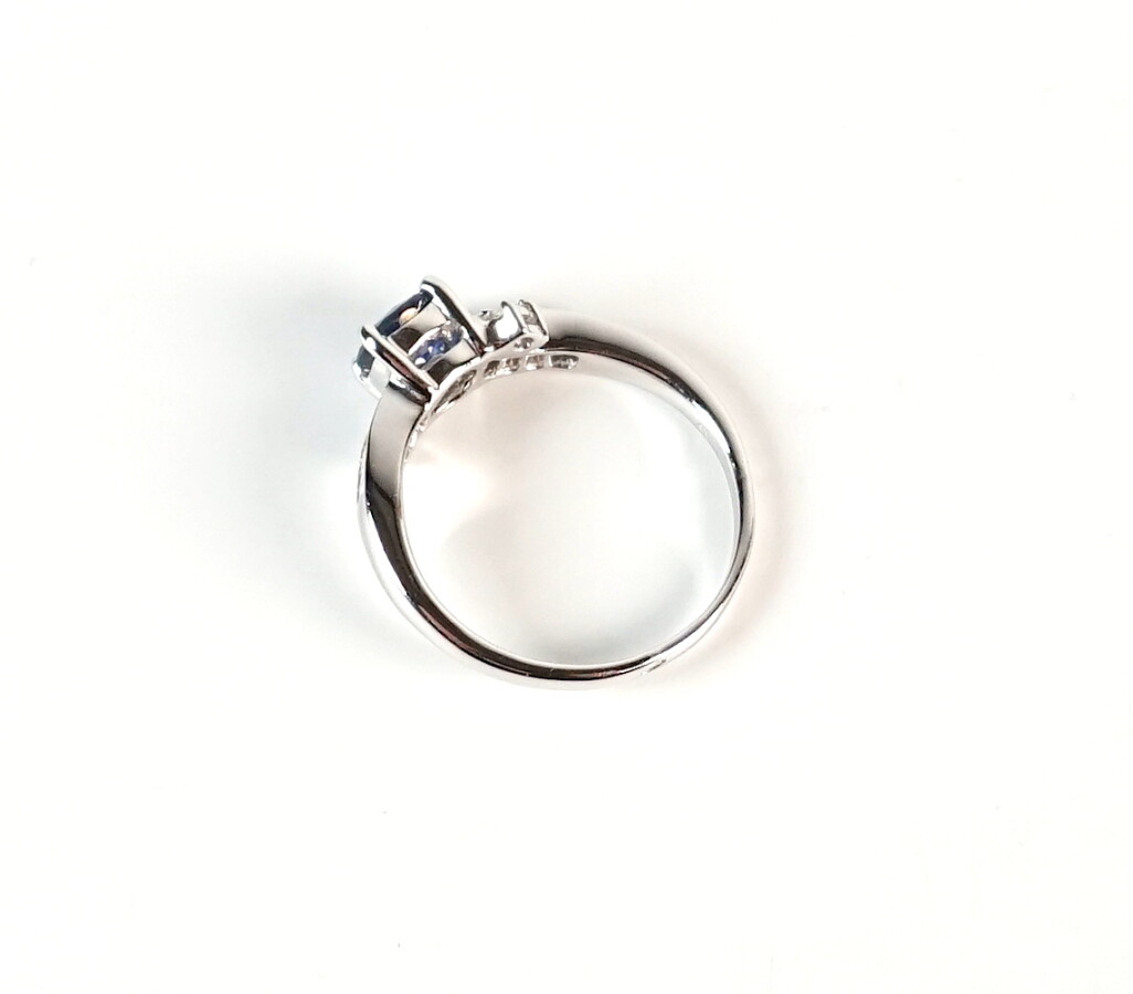 Bague sinueuse en or blanc 18 K (750/oo), sertie d'un saphir rond pesant 0.85 ct, épaulé de 2 diamants blancs taille moderne pour 0.04 ct et agrémenté de 14 diamants blancs taille baguette 0.15 ct. TDD 54. Poids brut : 3.65 g environ.