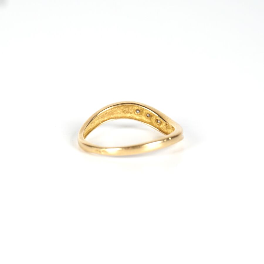 Bague sinueuse en or jaune 18K (750/oo), l'anneau serti de trois petits diamants taille brillant, TDD. 51. Larg. 3 mm. Poids brut : 1.8 g environ.