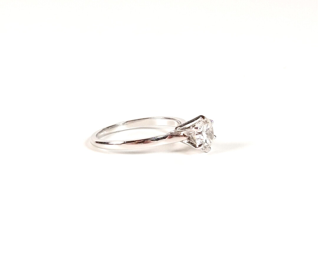 Bague "Solitaire" en or gris 18K (750/oo) et platine ornée d'un diamant rond taille moderne calibrant 0.7 ct environ (D. 6 mm), couleur supposée H, pas d'inclusion visible à l'oeil nu. TDD 49. Poids brut : 2.2 g environ.