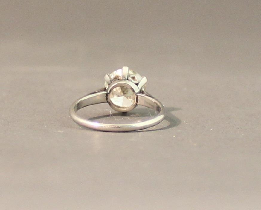 Bague solitaire monture platine, sertie d'un diamant taille brillant calibrant 2.55 cts environ, couleur supposée J, pureté SI2/P1, fluorescence medium. Poids brut : 4,4 g environ. *