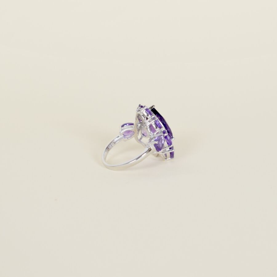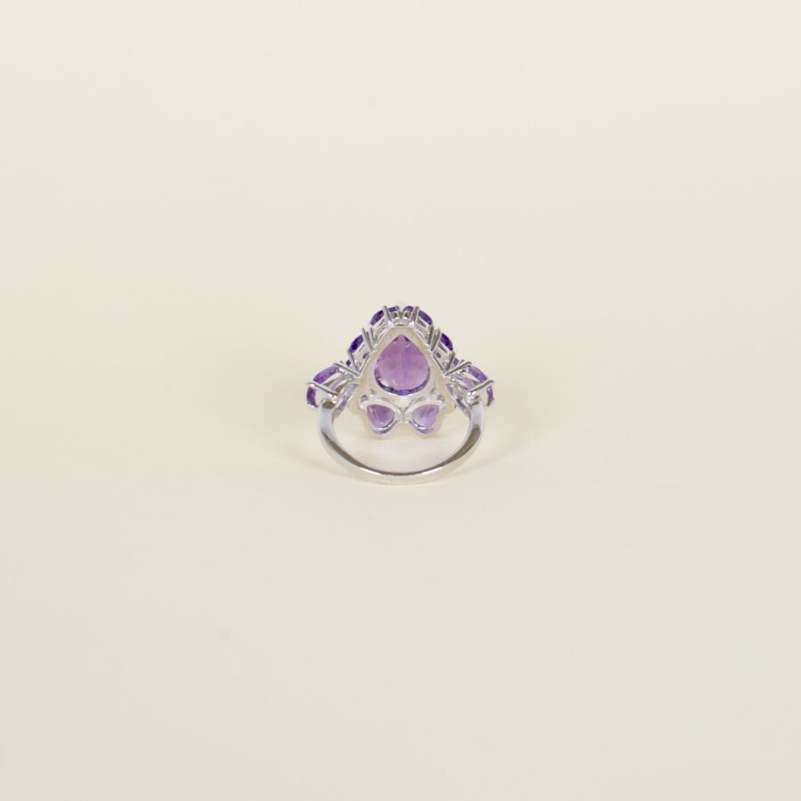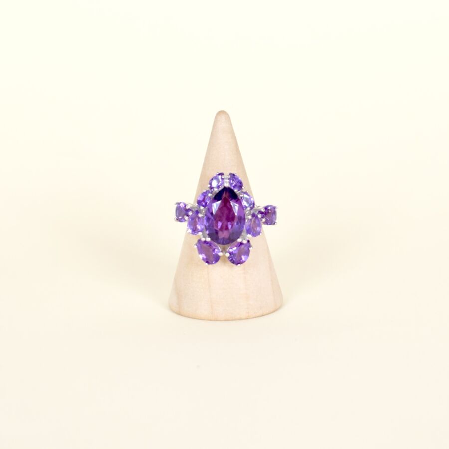 Bague stylisant une orchidée en argent (925/oo), centrée d'une pierre violette probablement améthyste taille poire (D. 15 x 10 mm)), entourée de dix pierres violettes probablement améthystes taille poire. Dim. Tête de bague : 2,4 x 2 x 0.5 cm. Poids brut : 6 g environ.