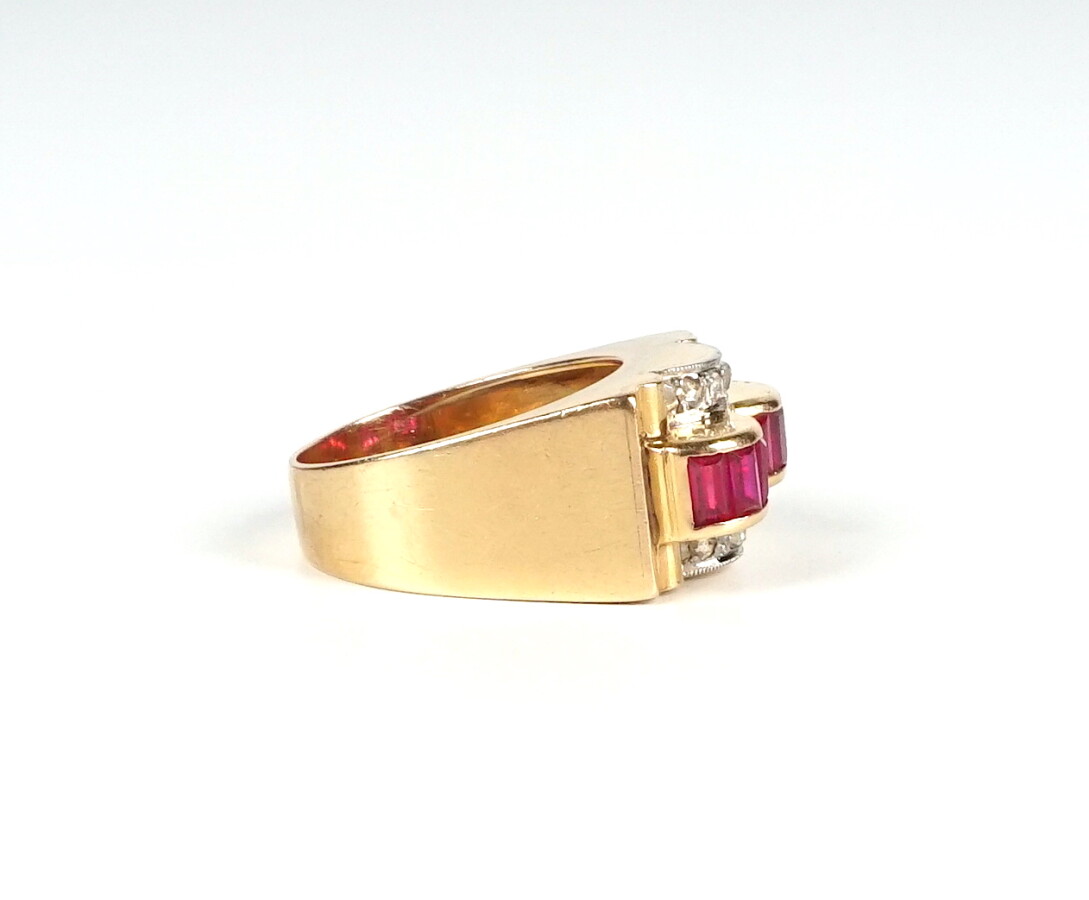 Bague "Tank" en or 18K (750/oo) et platine (850/oo) sertie de 2 lignes bombées serties pierres rouges taille baguette, probablement des rubis de synthèse, épaulés de diamants taillés en roses, circa 1940, Dim du motif : 1.8 x 1.1 cm. TDD 55. Poids brut : 8.2 g environ.