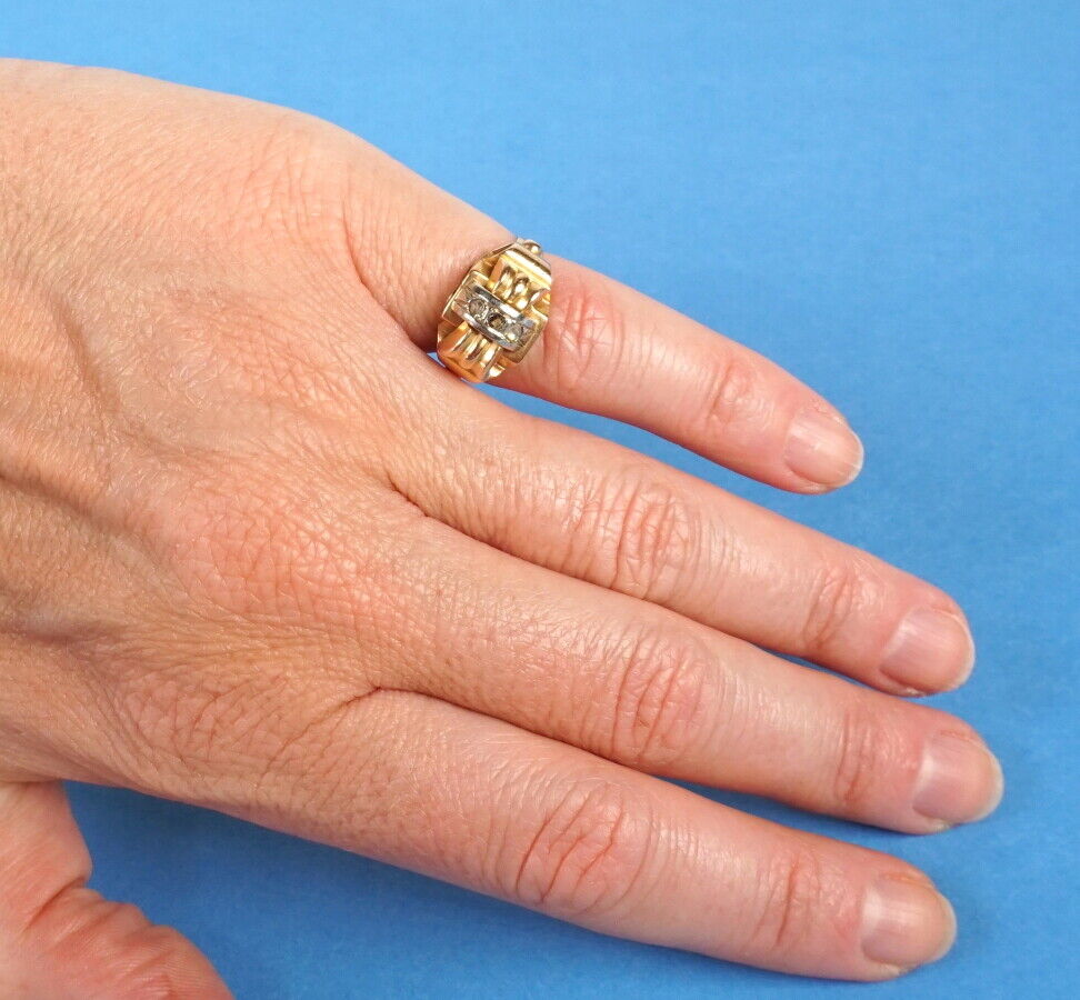 Bague "Tank" en or jaune 18K (750/oo) agrémentée d'un motif godronné serti d'une ligne de 3 diamants taille rose. TDD 48. Poids brut : 3.7 g environ.