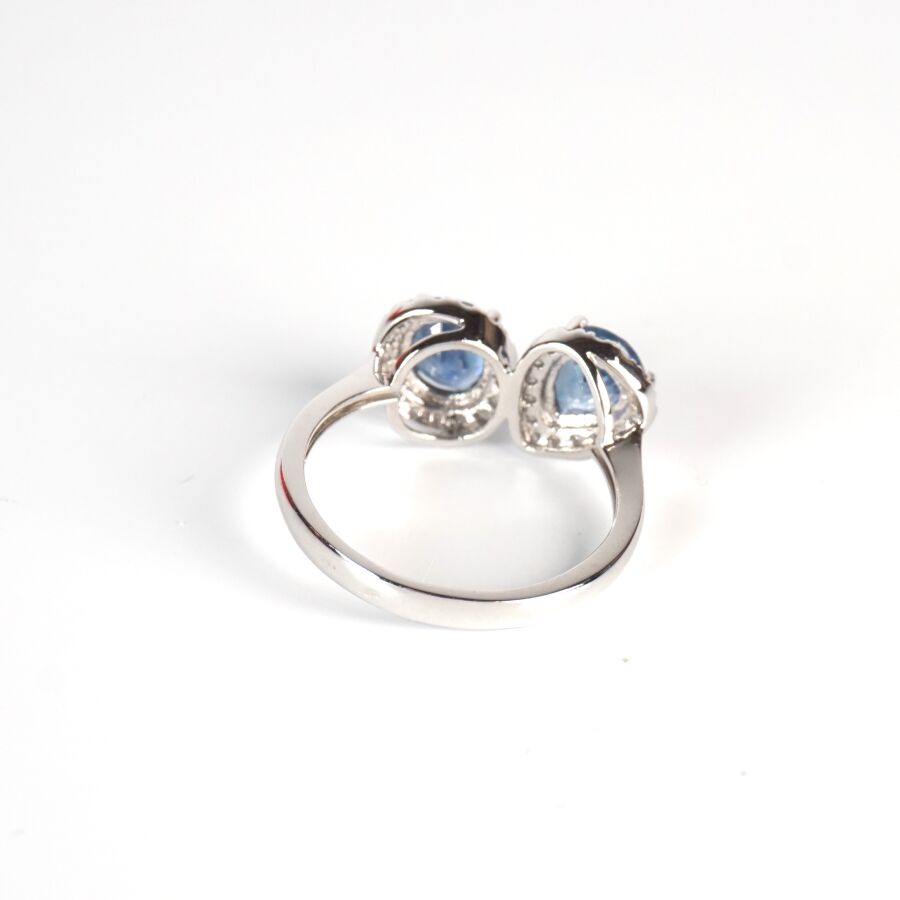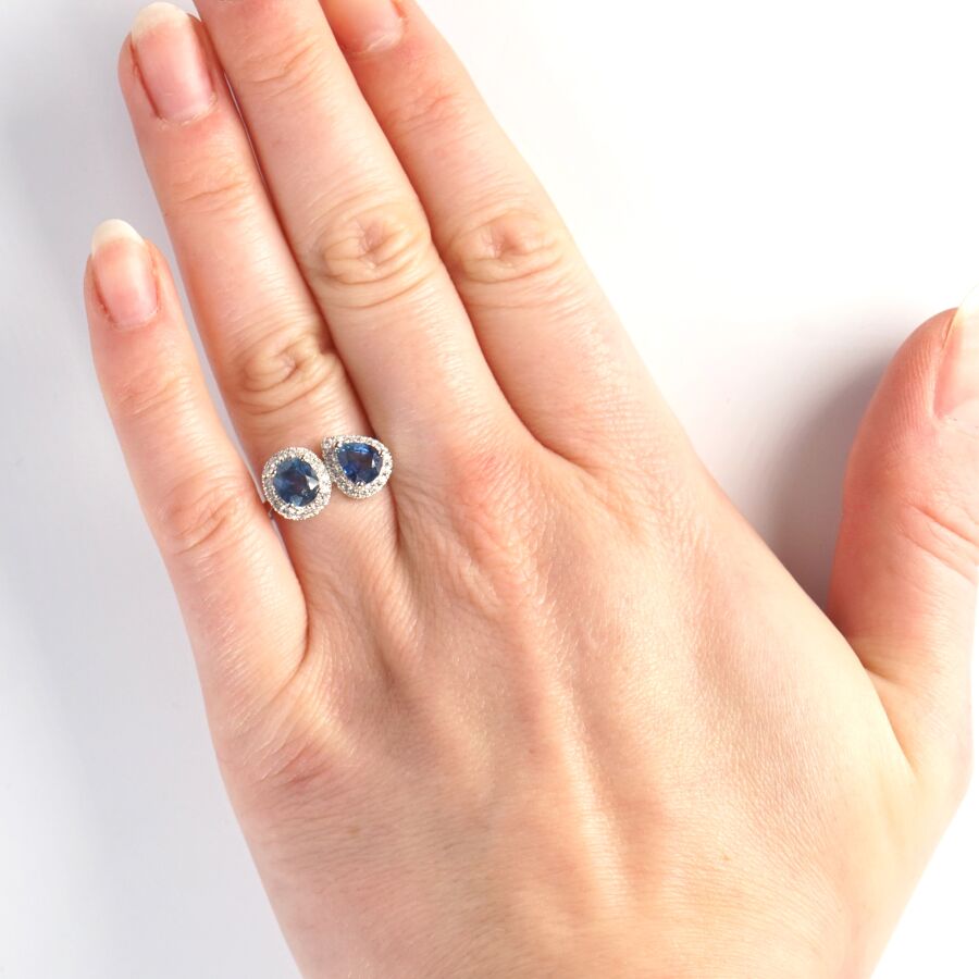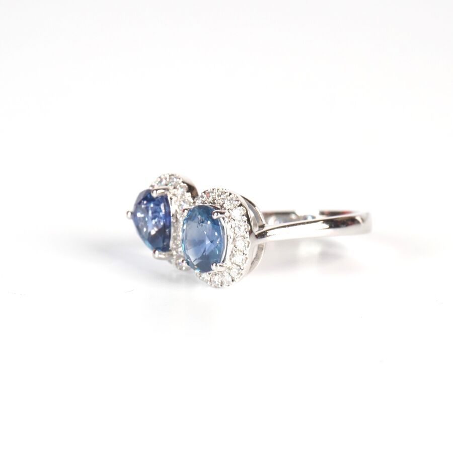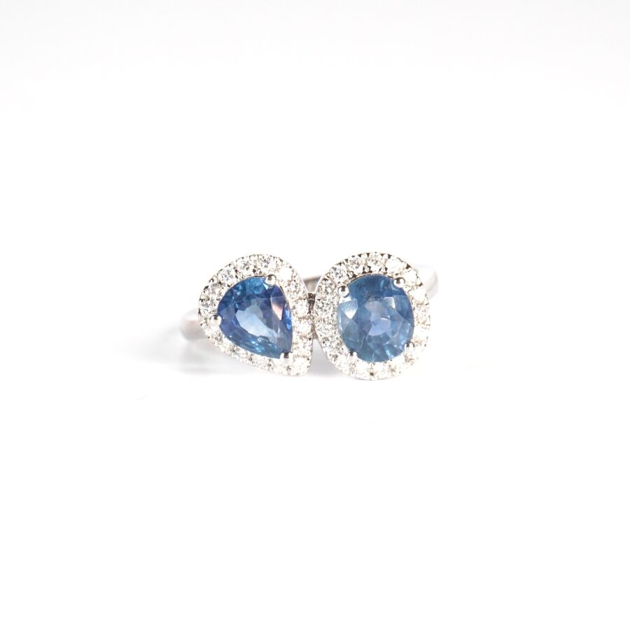Bague "Toi & Moi" en or gris 18K (750/oo) ornée de deux saphirs, l'un taille ovale, le second taille poire, calibrant au total 2.20 ct environ, dans un entourage de diamants taille moderne calibrant au total 0.30 ct environ, TDD. 54. Poids brut : 3.8 g environ.