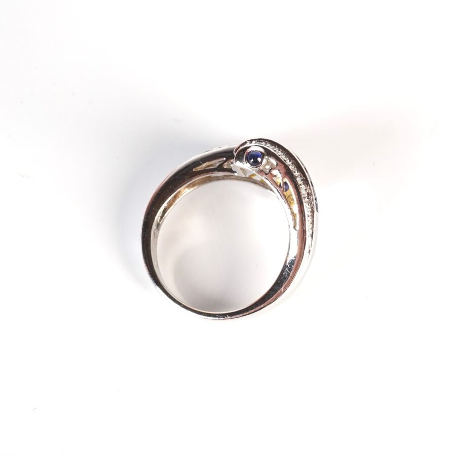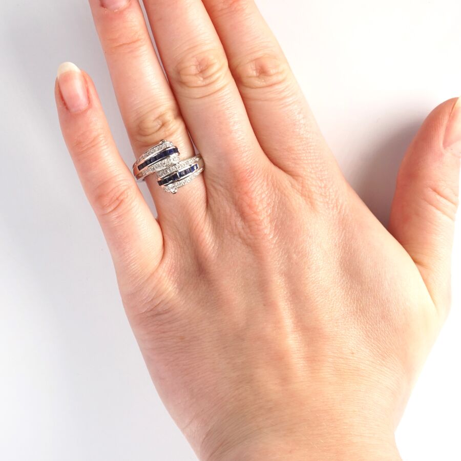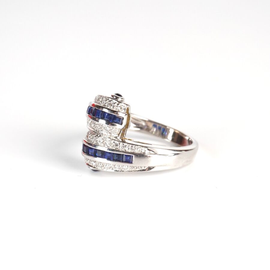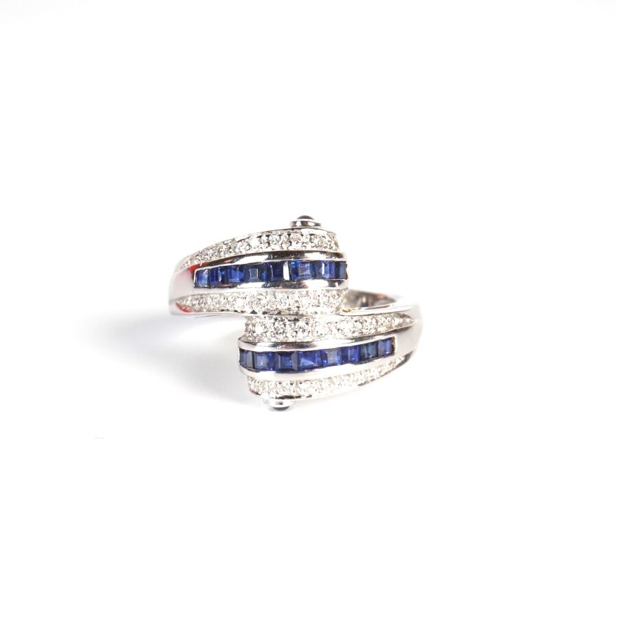 Bague "Toi & Moi" en or gris 18K (750/oo), sertie de deux lignes de saphirs calibrés entre deux lignes de diamants ronds taille brillant, TDD. 53.5. Poids brut : 6.5 g environ.