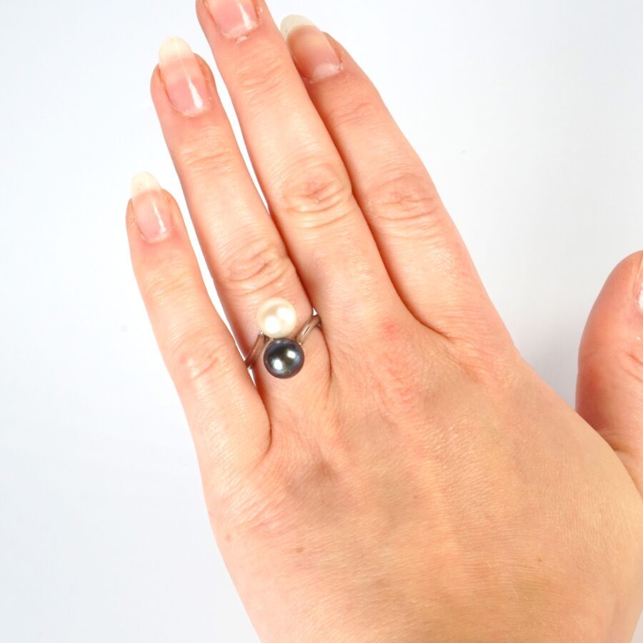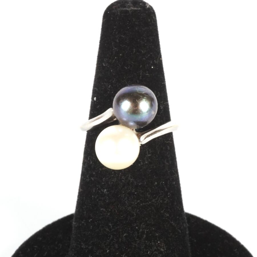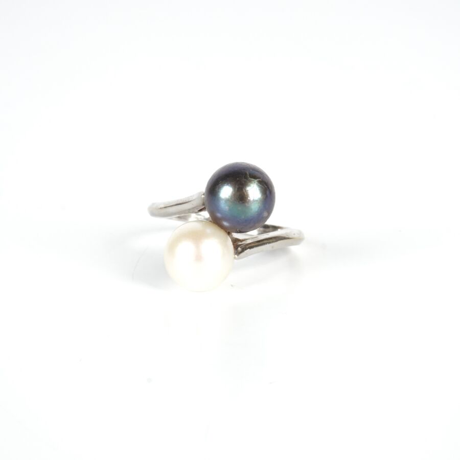 Bague "Toi & Moi" en or gris 18K (750/oo) sertie de deux perles, l'une blanche (D. 8/9 mm), la seconde de Tahiti (D. 8/9 mm), TDD. 52.5. Larg. Tête de bague : 1.6 cm. Poids brut : 5.7 g environ.