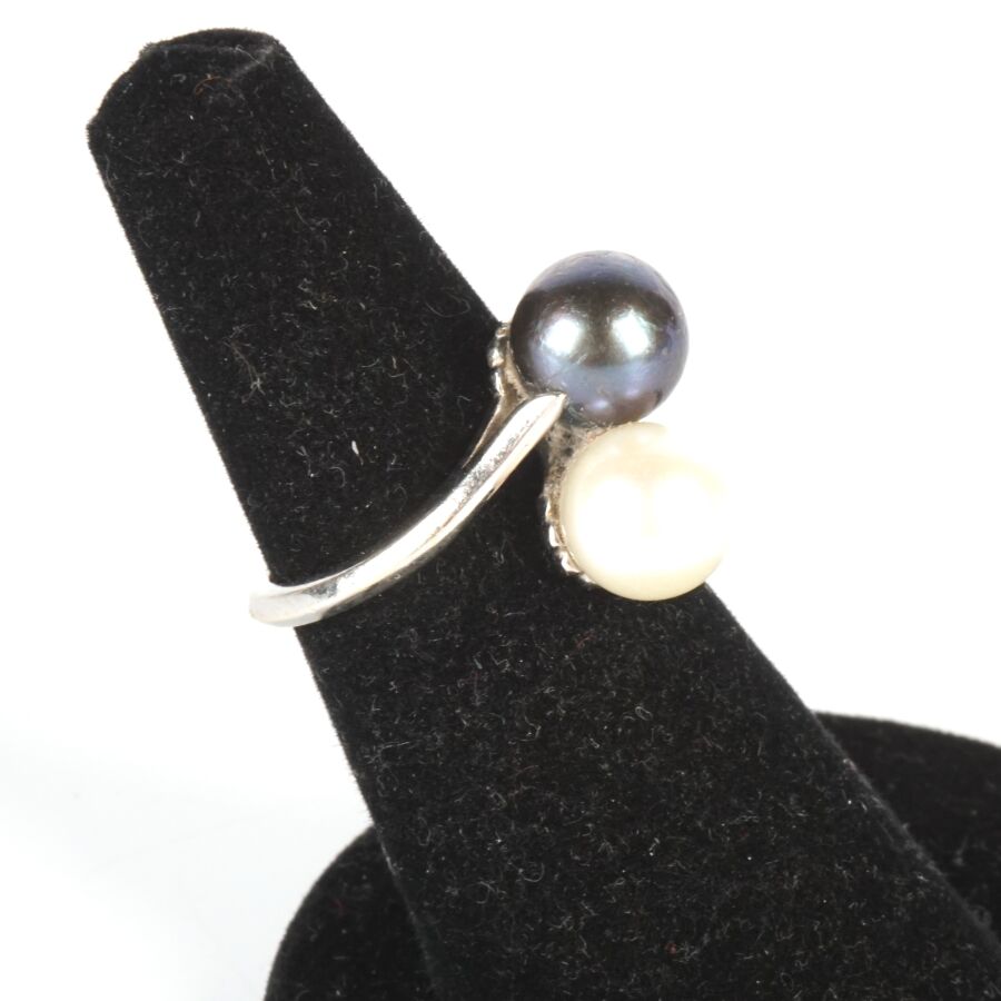 Bague "Toi & Moi" en or gris 18K (750/oo) sertie de deux perles, l'une blanche (D. 8/9 mm), la seconde de Tahiti (D. 8/9 mm), TDD. 52.5. Larg. Tête de bague : 1.6 cm. Poids brut : 5.7 g environ.