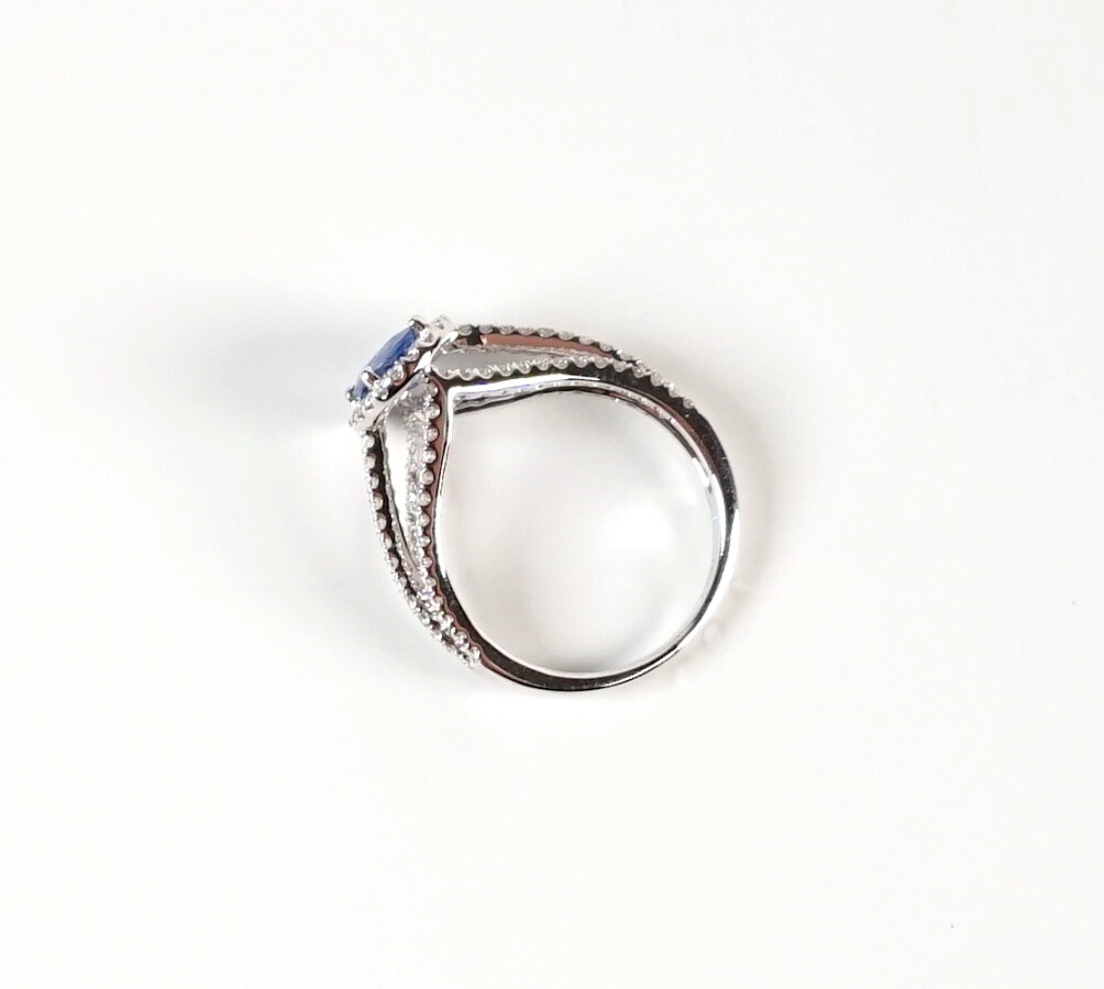 Bague "Triple anneaux" en or blanc 18 K (750/oo) sertie en son centre d'un saphir taille ovale pesant 1.05 ct, agrémenté de 104 diamants ronds pour 0.55 ct. TDD 51.5. Poids brut : 3.75 g environ.