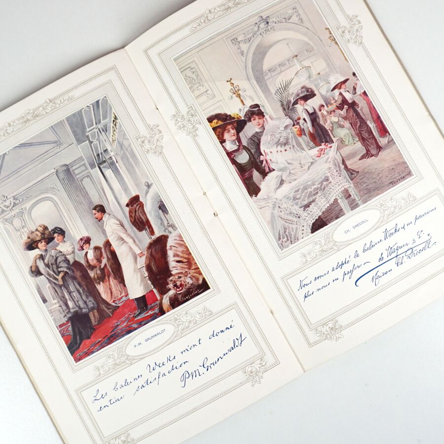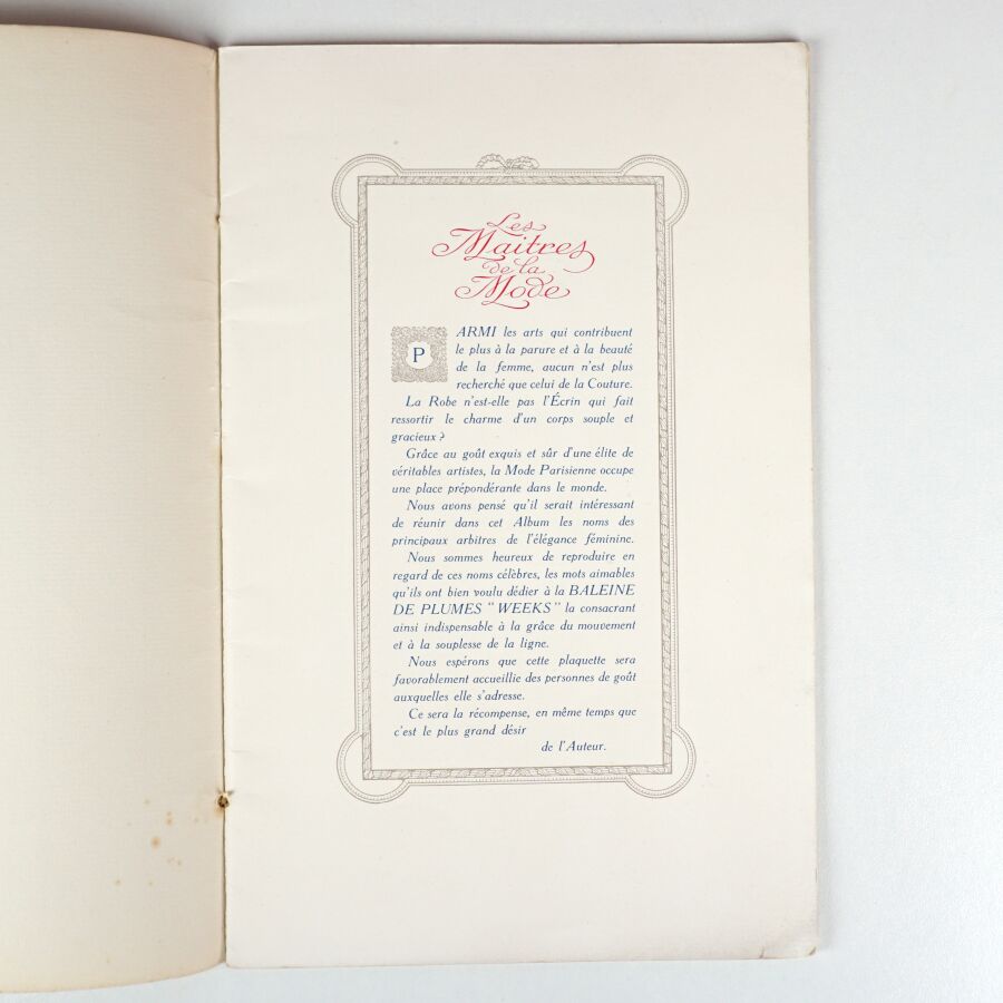 Élégante brochure publicitaire mettant en scène les grands couturiers de l'époque vantant la baleine de plumes ""Weeks"".
