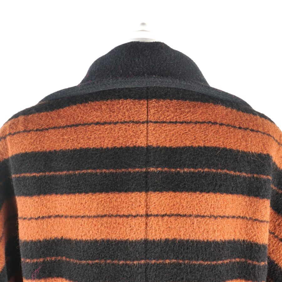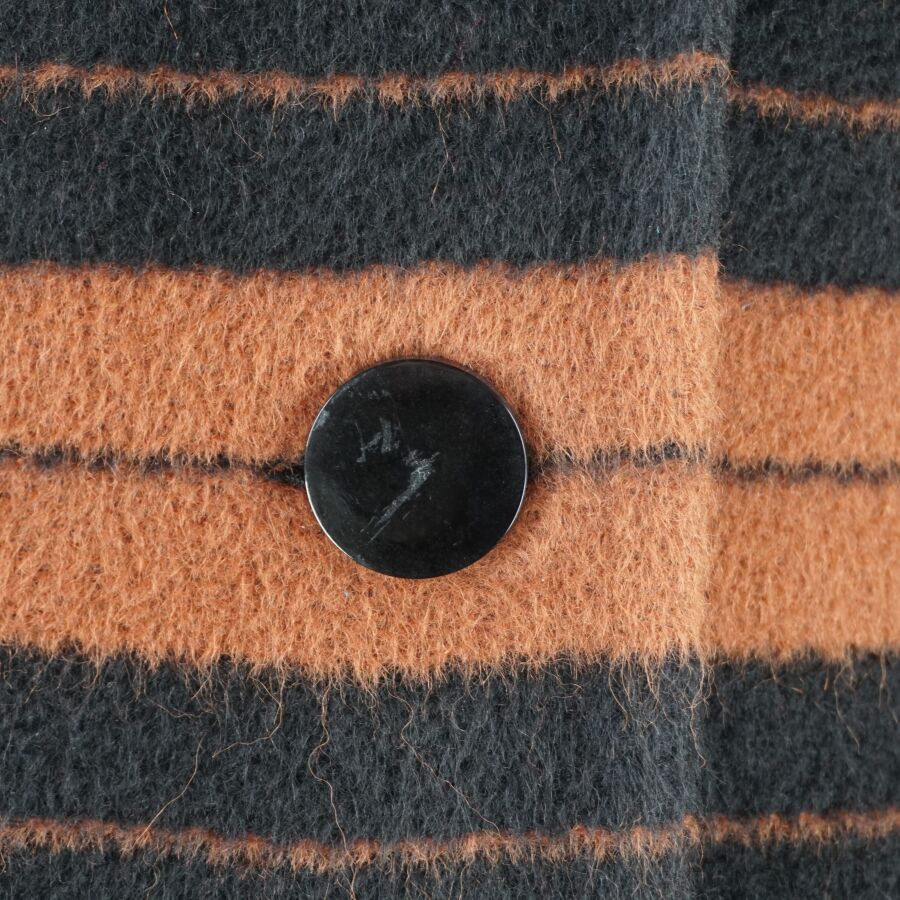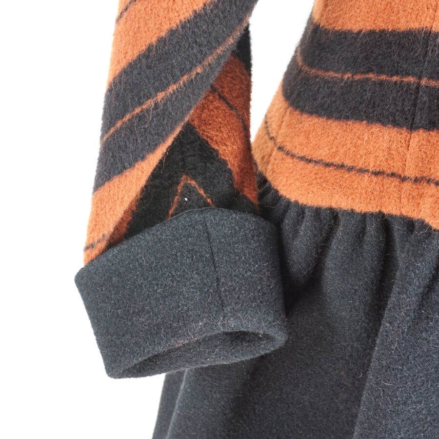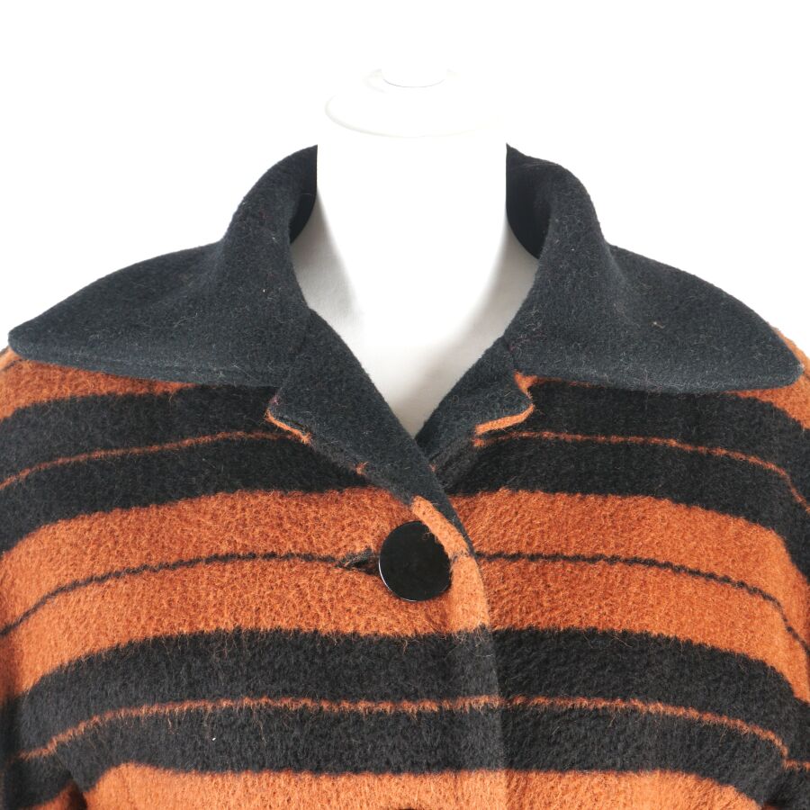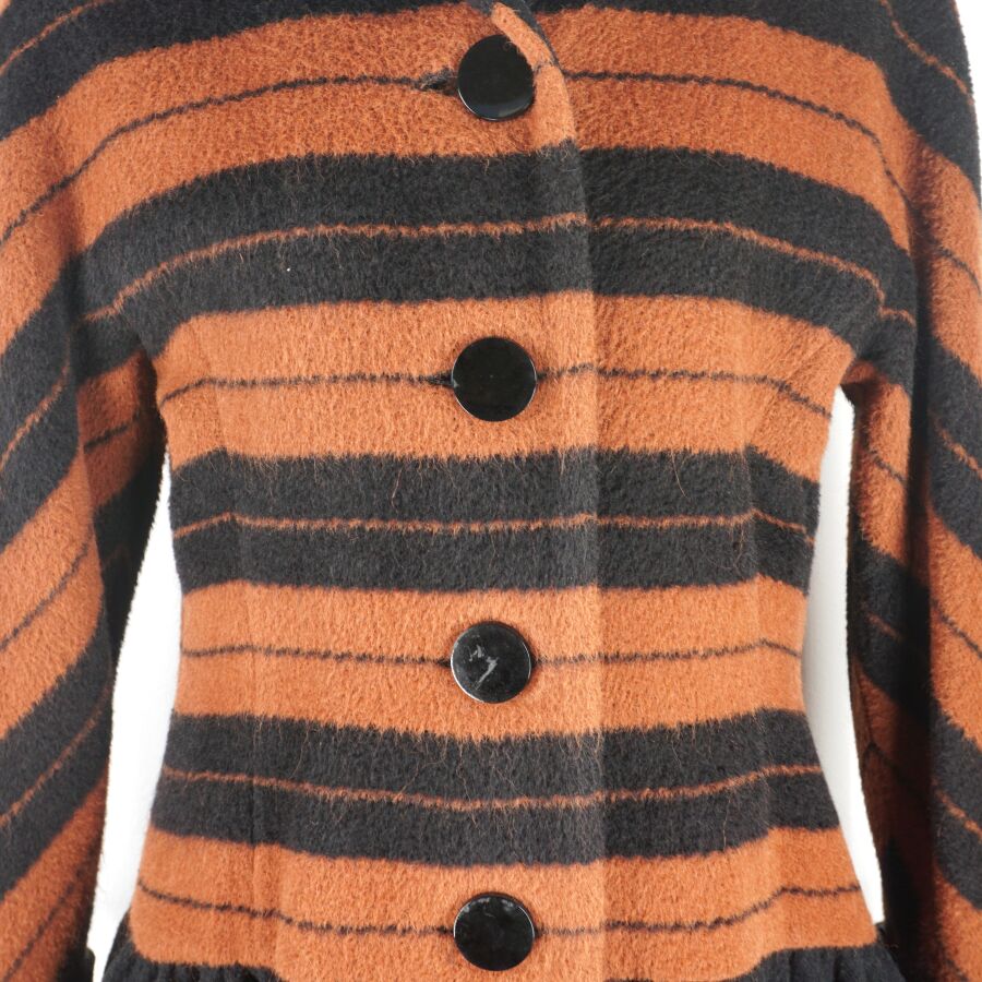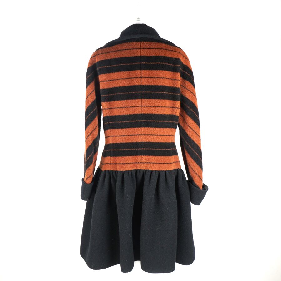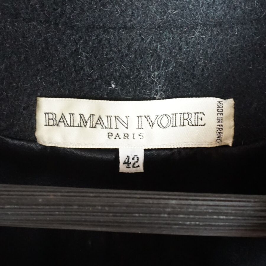BALMAIN IVOIRE - PARIS : Manteau en laine teintée brun et noir, col tailleur court, fermeture à l'avant par quatre boutons ronds noirs, partie basse dite "volante", taille indiquée 42, doublure en soie de couleur noir, avec son étiquette intérieure, L. Totale : 100 cm environ.