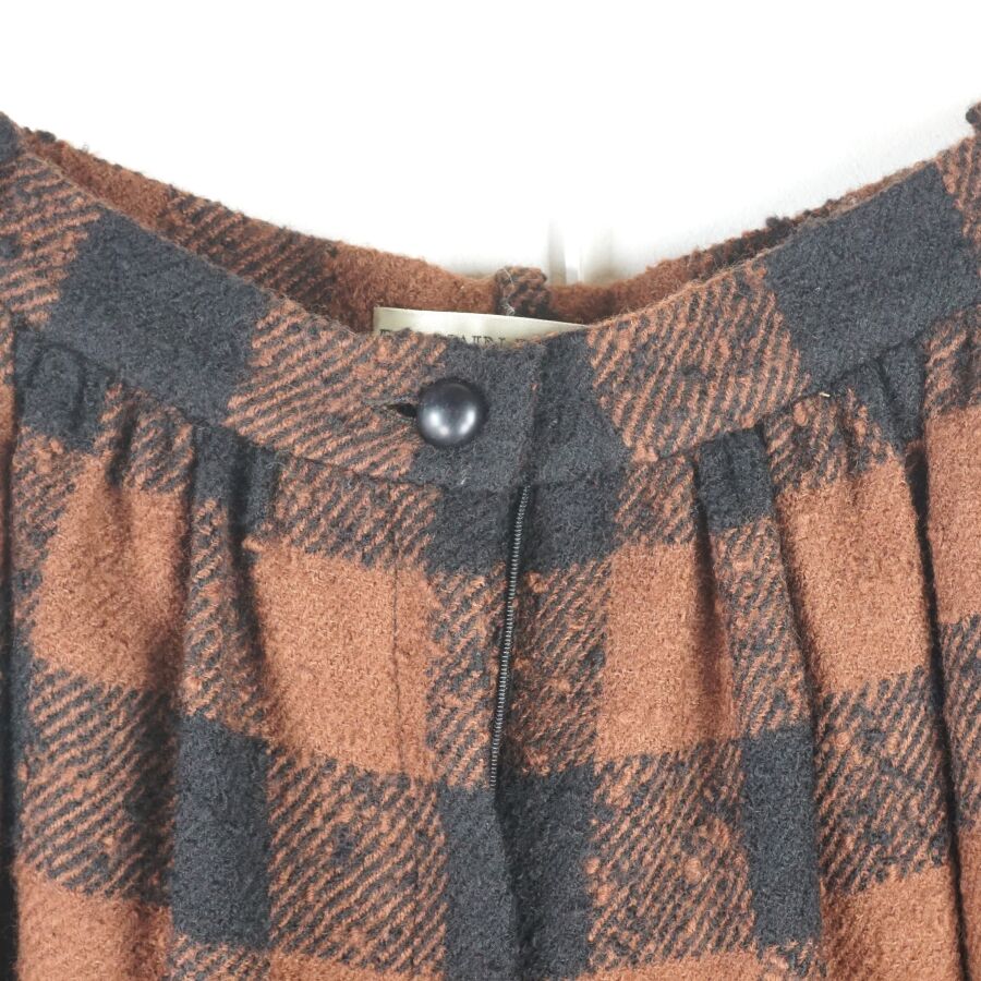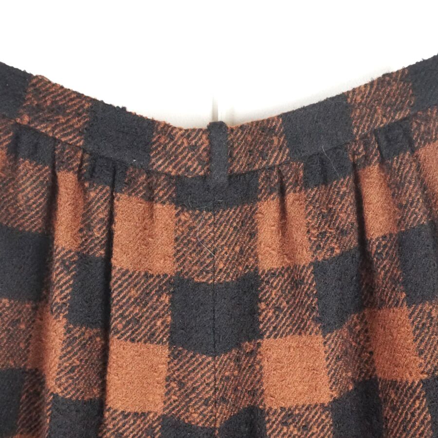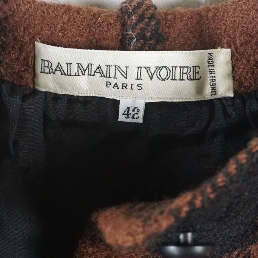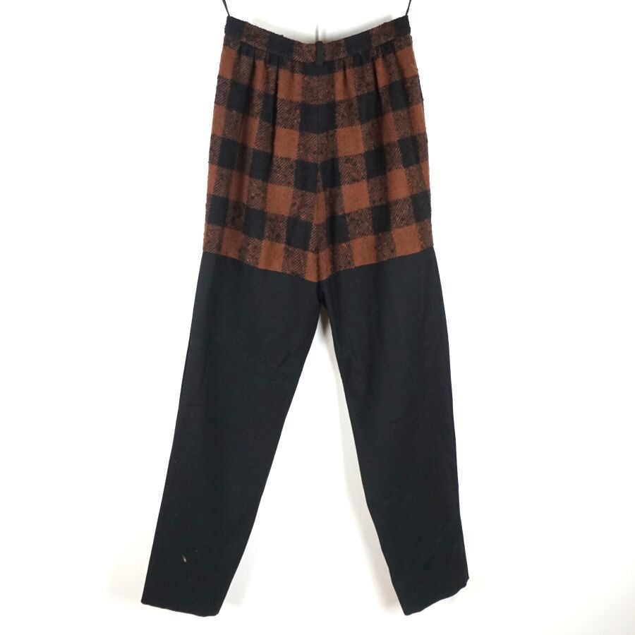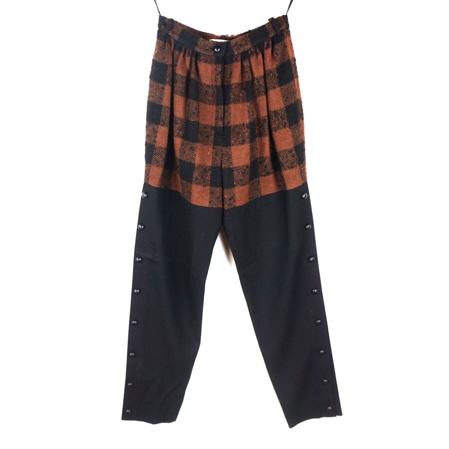 BALMAIN IVOIRE - PARIS : Pantalon en laine et matières synthétiques bicolore, marron et noir, à motif de carreaux en partie haute, les jambes ornées sur chaque côté de huit boutons noirs cousus, fermeture à la taille par un bouton et une fermeture zippée, étiquette intérieure, taille indiquée 42, L. Totale : 107 cm. Larg. Taille : 34 cm.