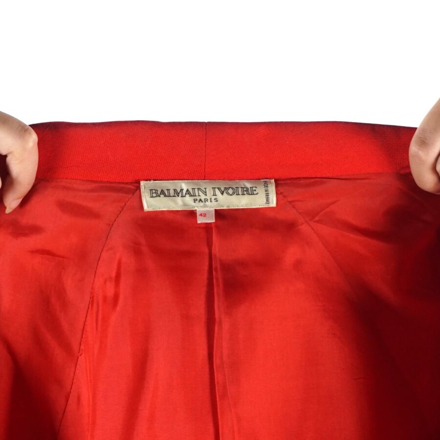 BALMAIN IVOIRE - PARIS : Tailleur en viscose rouge, comprenant une veste blazer, col tailleur, fermeture à l'avant par trois boutons dorés, manches longues terminant par un bouton doré, et sa jupe droite, fermeture à la taille par un crochet métallique et une fermeture zippée, deux poches latérales, étiquettes intérieures, taille indiquée 42, présenté avec son cintre logoté, H. Totale Veste : 62 cm. L. Jupe : 56.5 cm. Larg. Taille : 40/40.5 cm (élastique à la taille de la jupe détendu, petites traces notamment aux extrémités des manches).