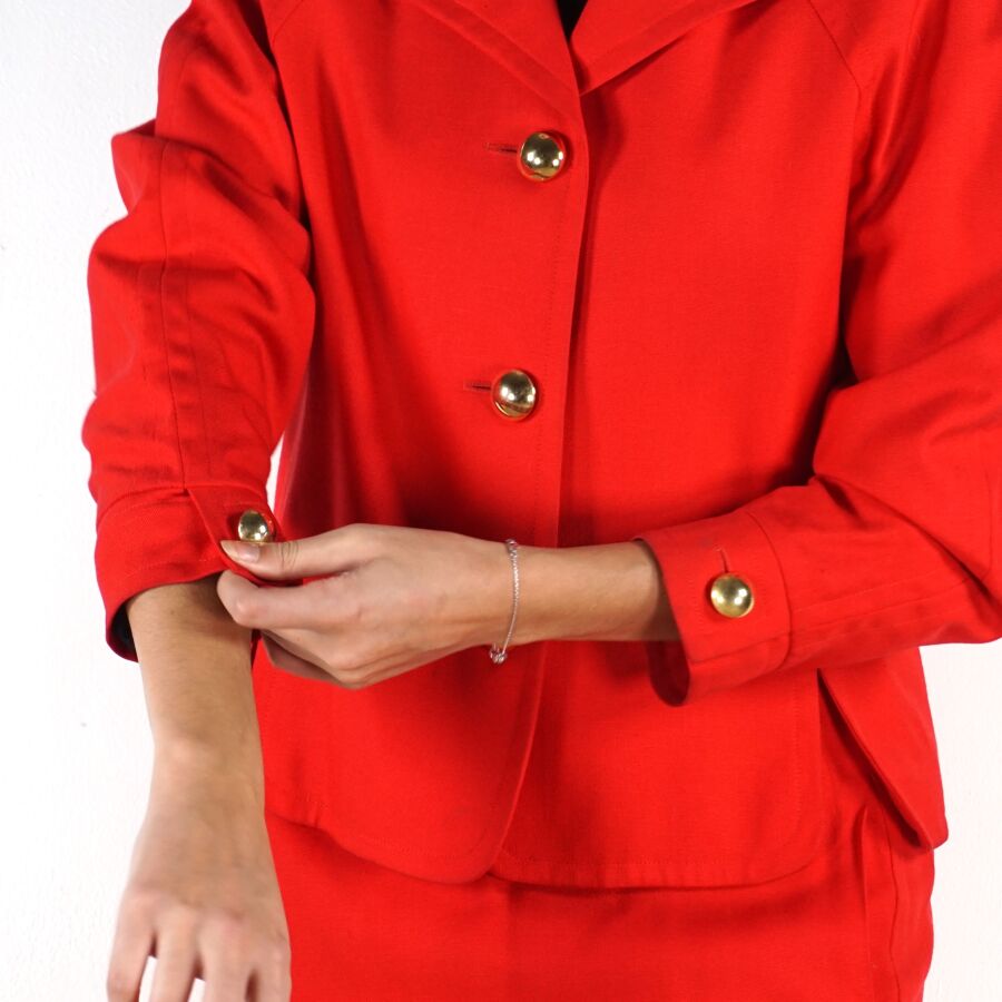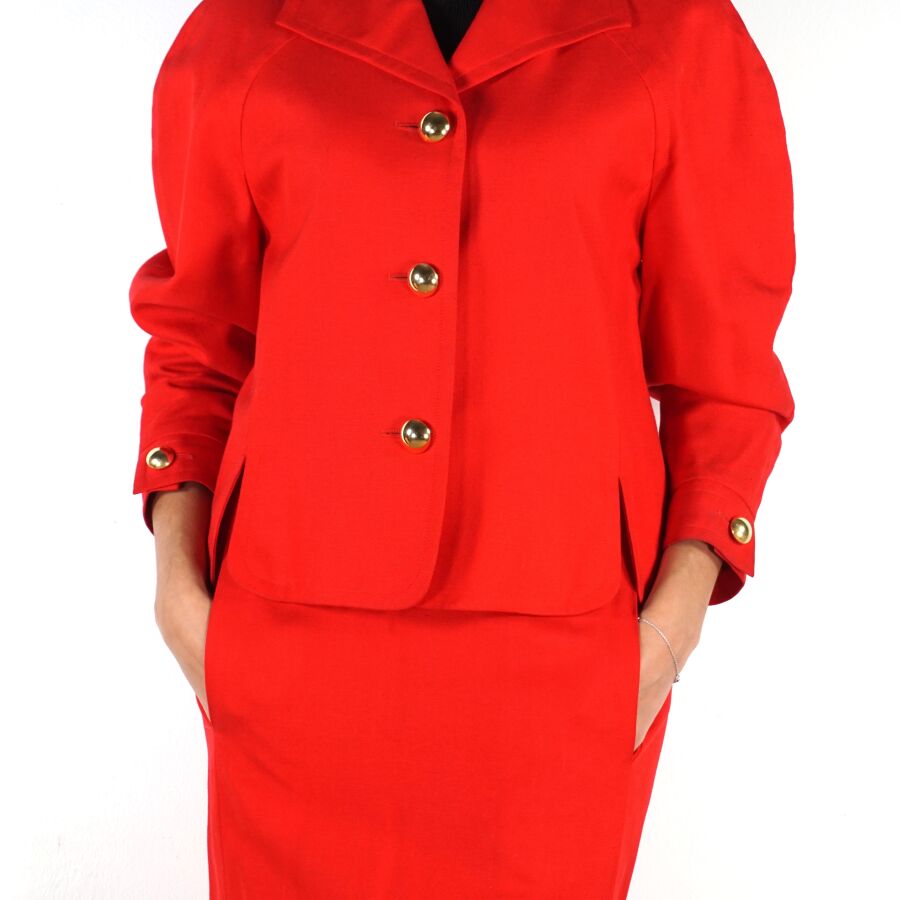 BALMAIN IVOIRE - PARIS : Tailleur en viscose rouge, comprenant une veste blazer, col tailleur, fermeture à l'avant par trois boutons dorés, manches longues terminant par un bouton doré, et sa jupe droite, fermeture à la taille par un crochet métallique et une fermeture zippée, deux poches latérales, étiquettes intérieures, taille indiquée 42, présenté avec son cintre logoté, H. Totale Veste : 62 cm. L. Jupe : 56.5 cm. Larg. Taille : 40/40.5 cm (élastique à la taille de la jupe détendu, petites traces notamment aux extrémités des manches).