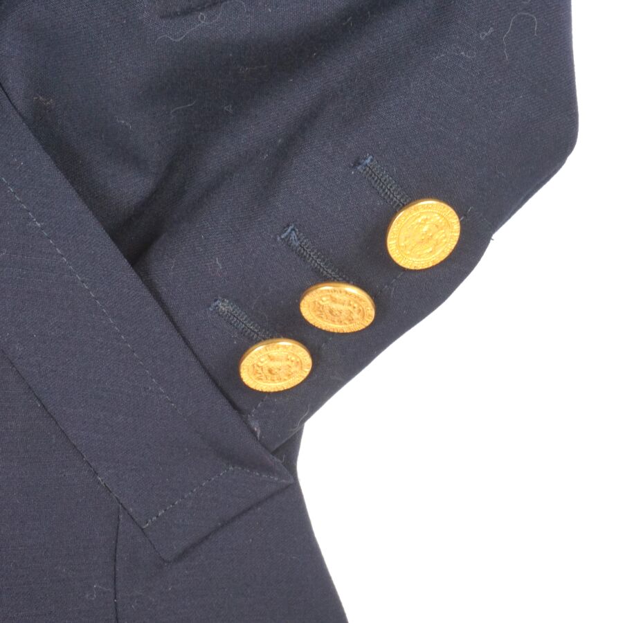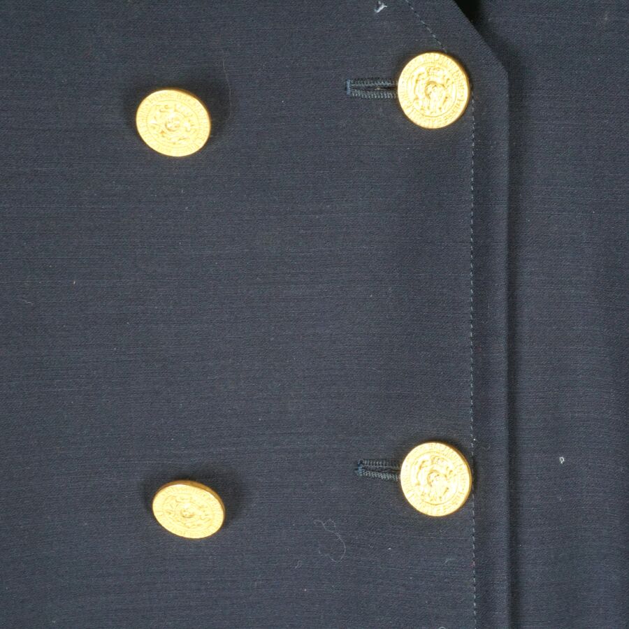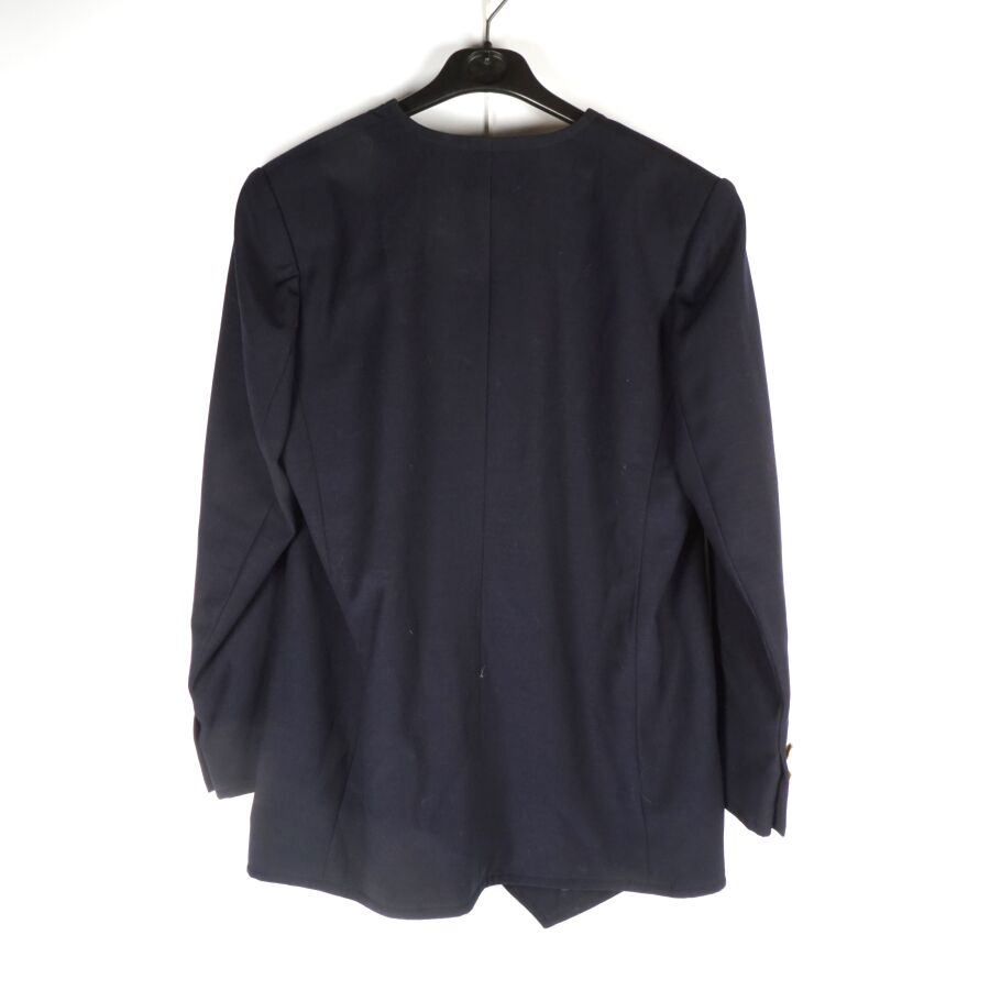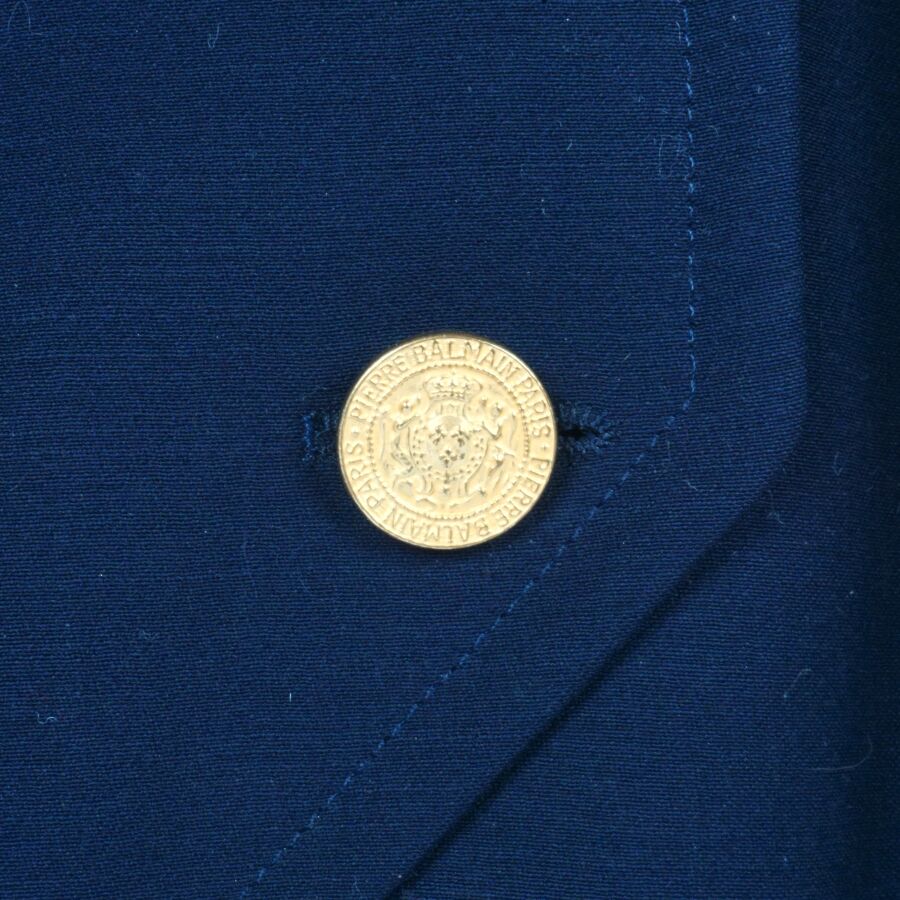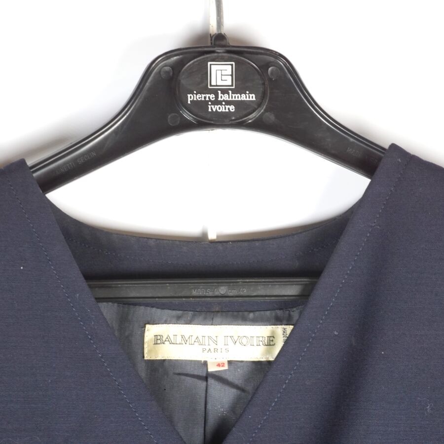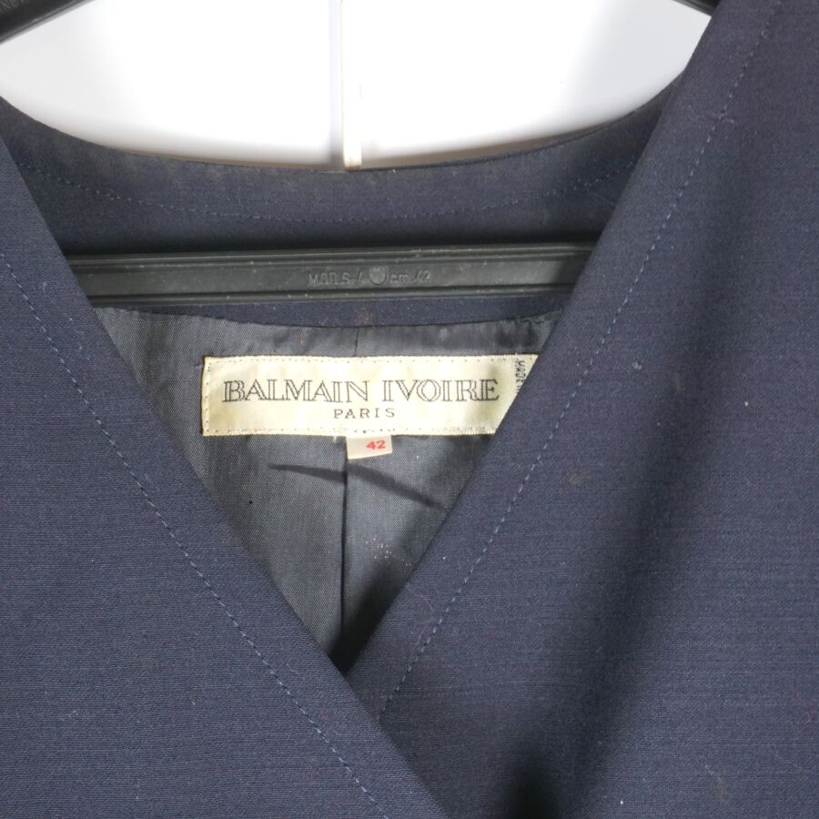 BALMAIN IVOIRE - PARIS : Veste longue en laine bleu nuit, col V, fermeture à l'avant par deux rangées de cinq boutons chacune, les boutons dorés et logotés à motif du blason, manches longues ornées chacune aux extrémités de trois boutons, deux poches basses latérales, taille indiquée 42, étiquette intérieure, présentée avec son cintre logoté, L. Totale : 78 cm (petites traces, un trou).