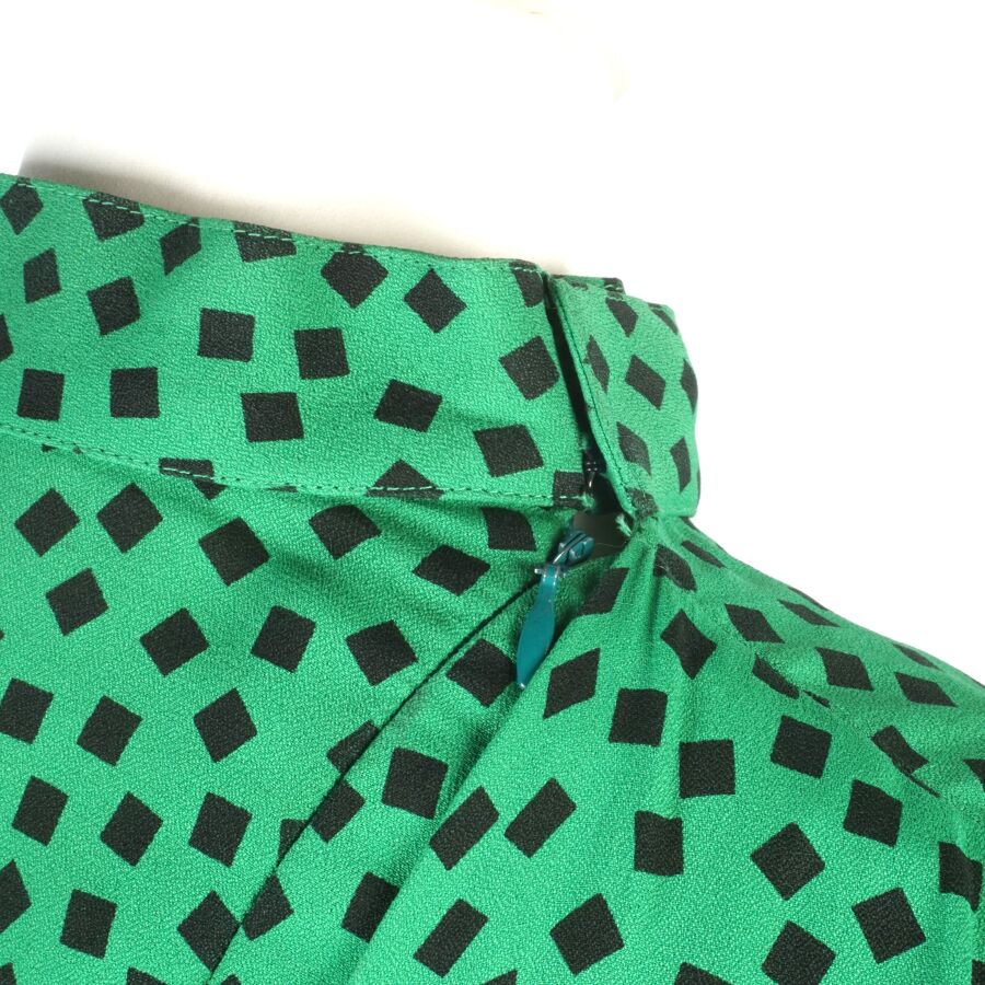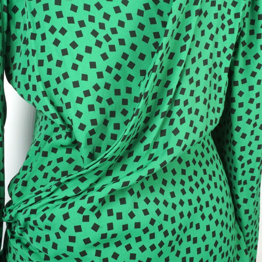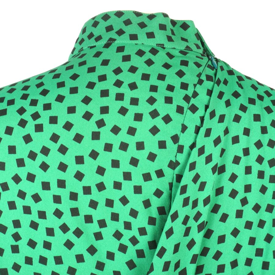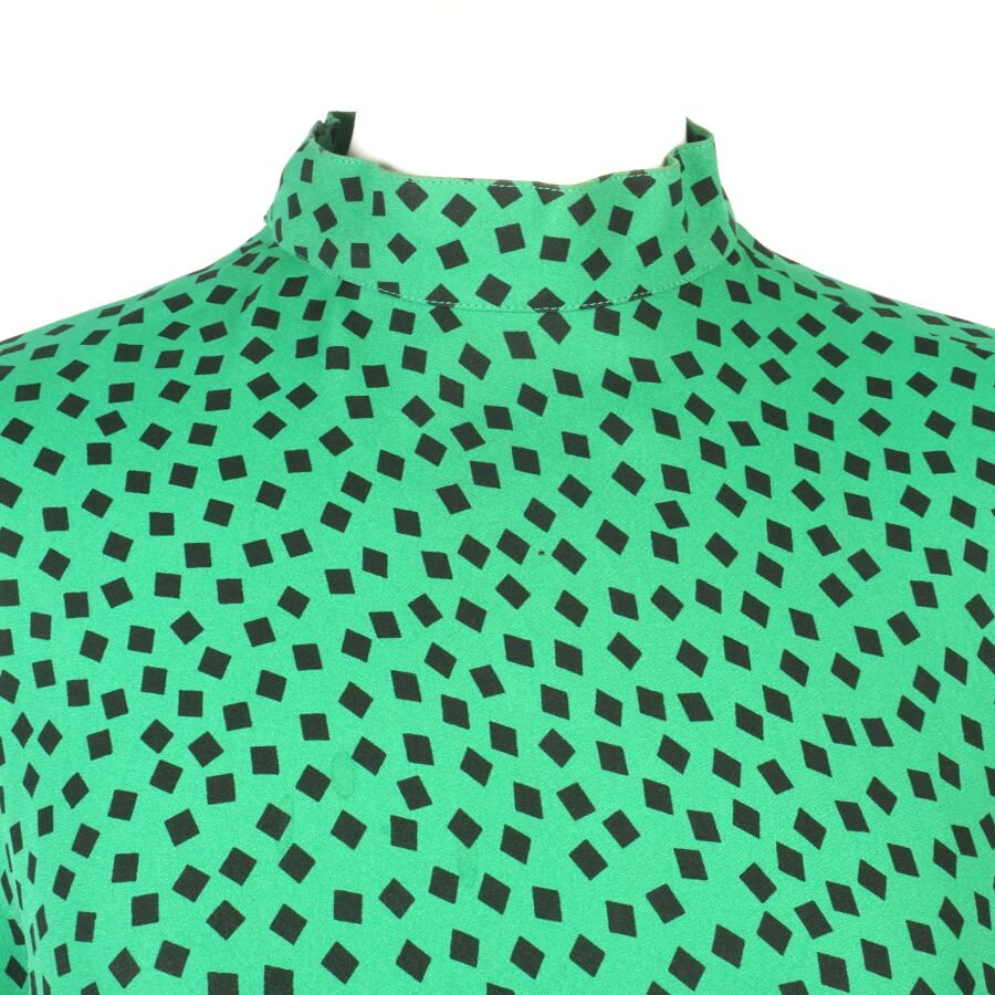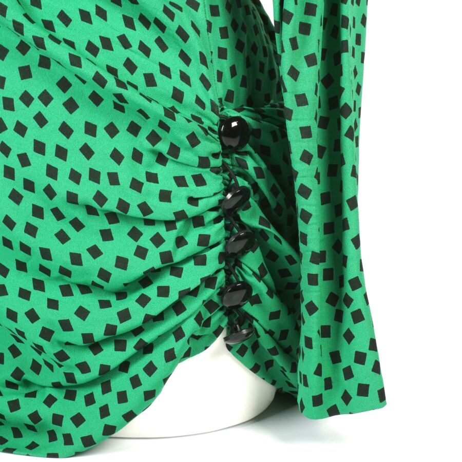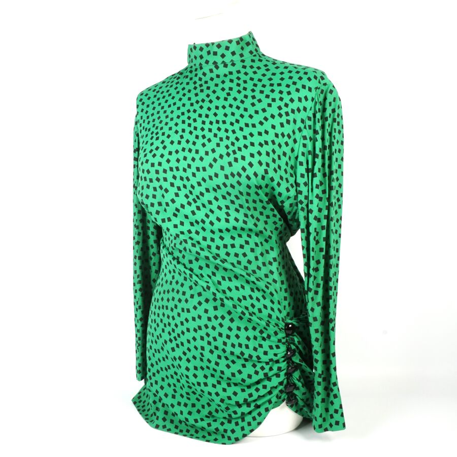 BALMAIN IVOIRE : Top asymétrique en viscose vert à motif de carreaux noirs, col montant, fermeture zippée à l'arrière, taille cintrée ornée par cinq boutons laqués noirs disposés en chute formant un plissé, tissu supplémentaire dans le dos apportant un effet "volant" à l'arrière, étiquette intérieure, taille indiquée 42, présenté avec son cintre logoté, H. Totale : 82 cm à 90 cm (à l'arrière) (petites taches très légères).
