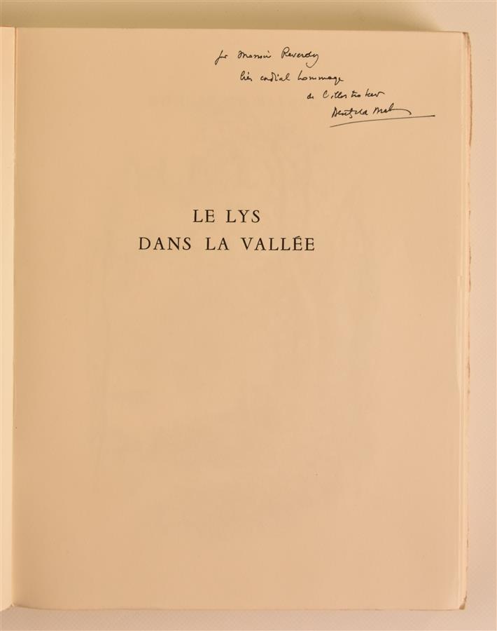 BALZAC (Honoré de) - Le lys dans la vallée - Paris ; Paul Hartmann, 1947 - 1 volume In-8° broché sous couverture rempliée et emboîtage bleu gris (couverture jaunie) - Frontispice et illustrations in et hors-texte en noir par Berthold Man - Bon exemplaire numéroté sur vélin, enrichi d'1 envoi autographe signé de Berthold Man à M. Reverdy au faux titre.