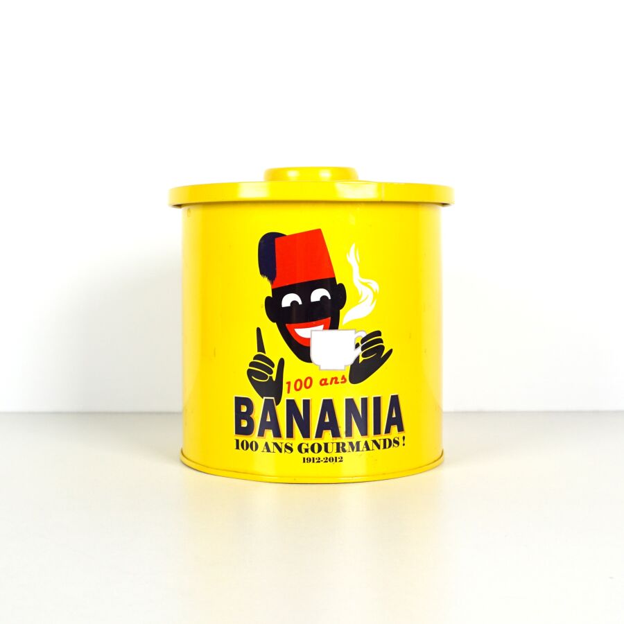 BANANIA : Boîte publicitaire en tôle lithographiée laquée, H. 13 cm.