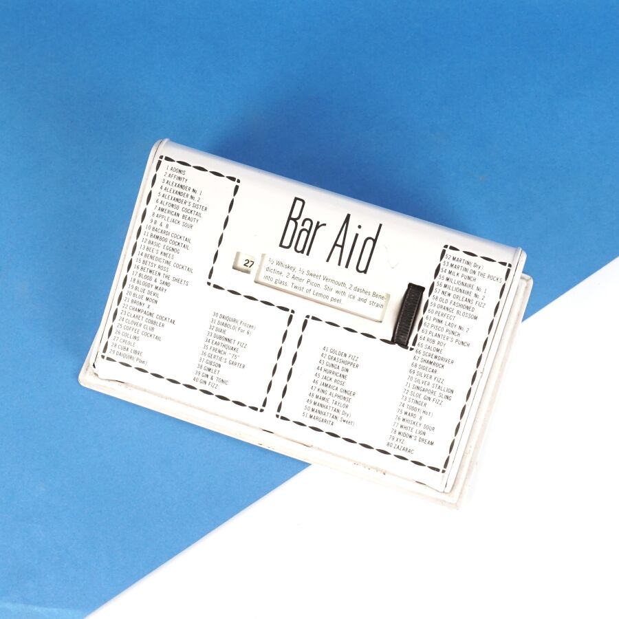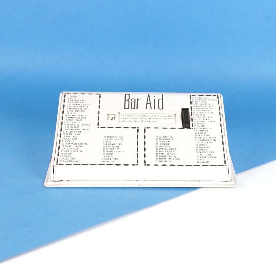 Bar Aid, boîte en métal contenant un déroulé de 80 recettes de cocktails, Dim. 22.5 x 13.8 x 7 cm (petites usures).