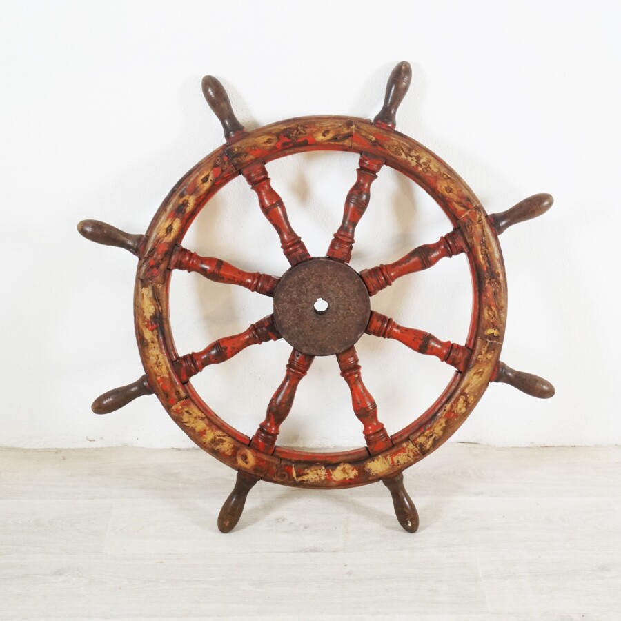 Barre à roue, bois anciennement laqué rouge, Diam : 95 cm (écaillures).