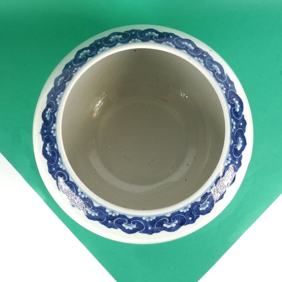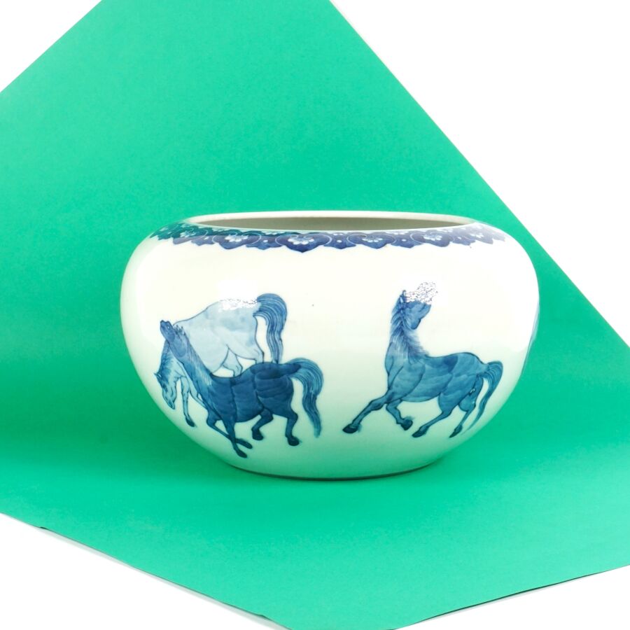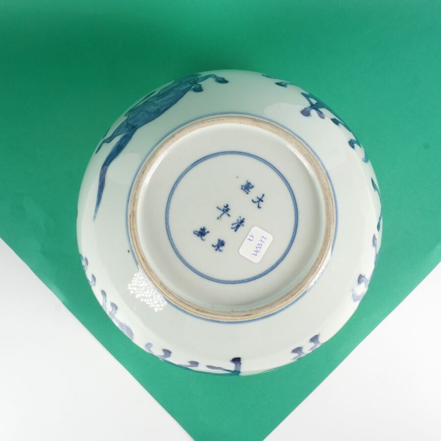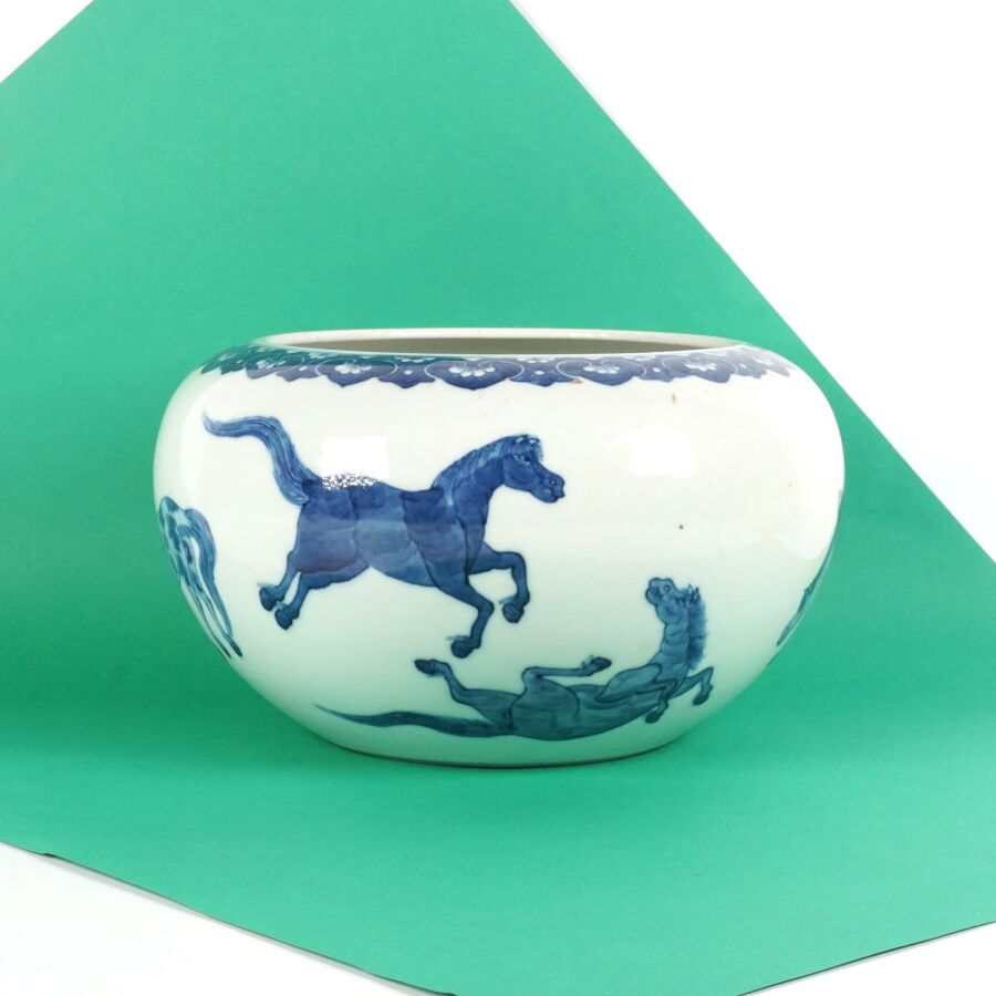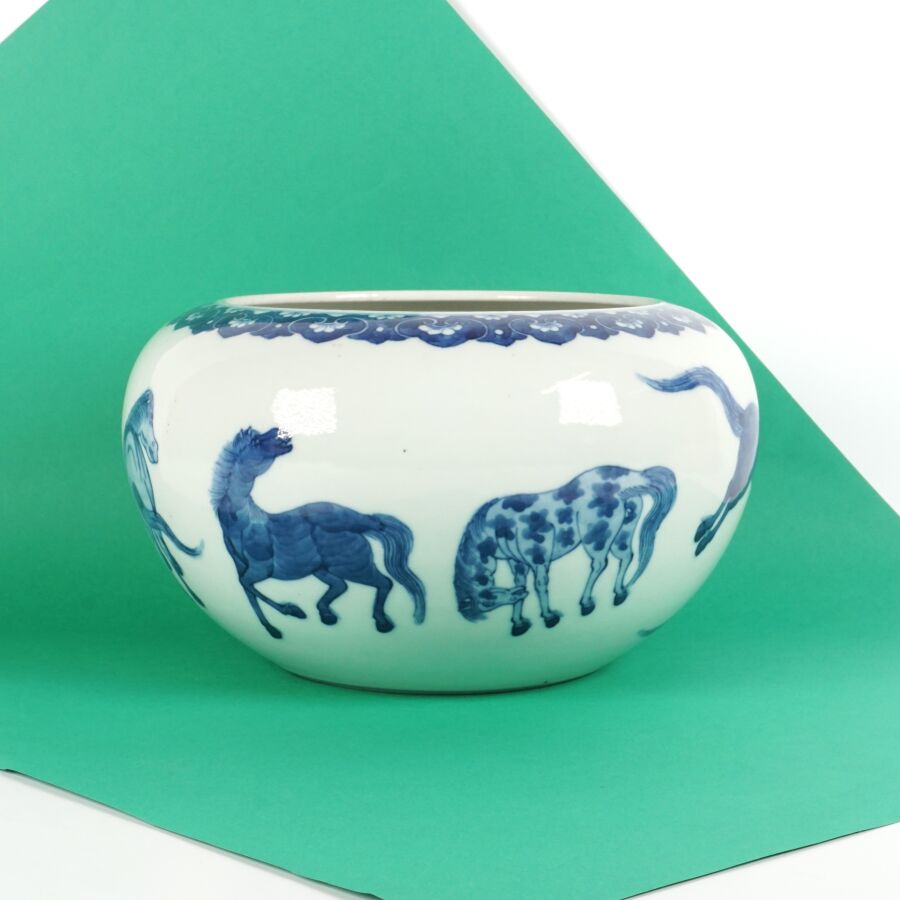 Bassin en porcelaine blanche, à décor en bleu sous couverte de huit chevaux, dans le goût de Castiglione, porte une marque apocryphe Kangxi en kaishu au revers, Chine, 19ème siècle, H. 15,5, D. 27 cm.
