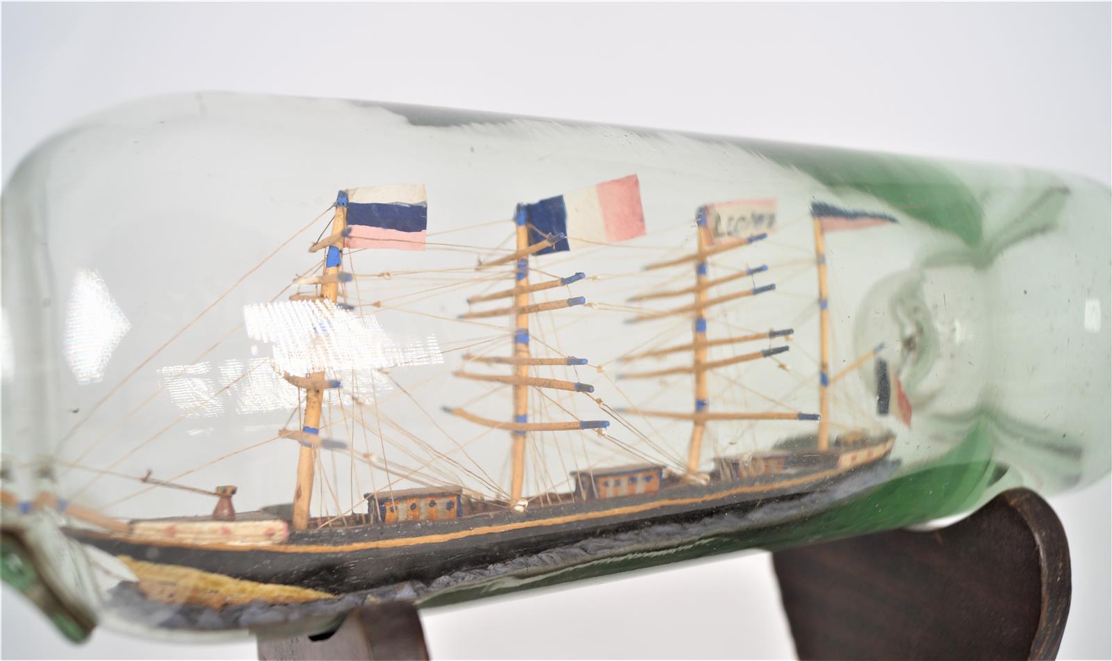 Bateau-bouteille présentant un quatre-mâts barque, pavillon français, 20e siècle, L. 31 cm.