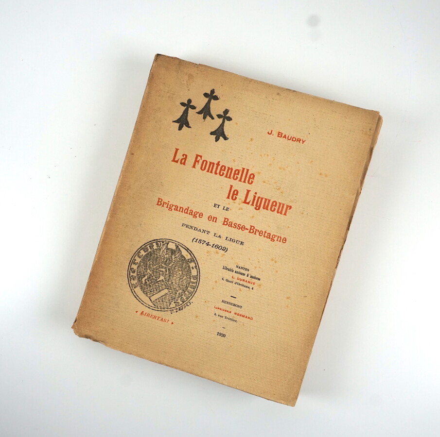 BAUDRY (J.) - La Fontenelle le ligueur et le brigandage en Basse-Bretagne pendant la ligue (1574-1602) - Nantes ; L. Durance, Hennebont ; Imprimerie Normand, 1920 - 1 volume In-8° broché sous couverture illustrée d'1 vignette (dos frotté) - Trou en milieu de dernier feuillet de table (collé au dernier contre plat) - Tableaux généalogiques dépliants et illustrations hors texte en noir - 3 ex-libris : Le Blohic - Bon exemplaire.
