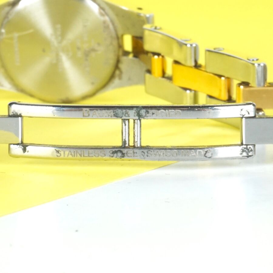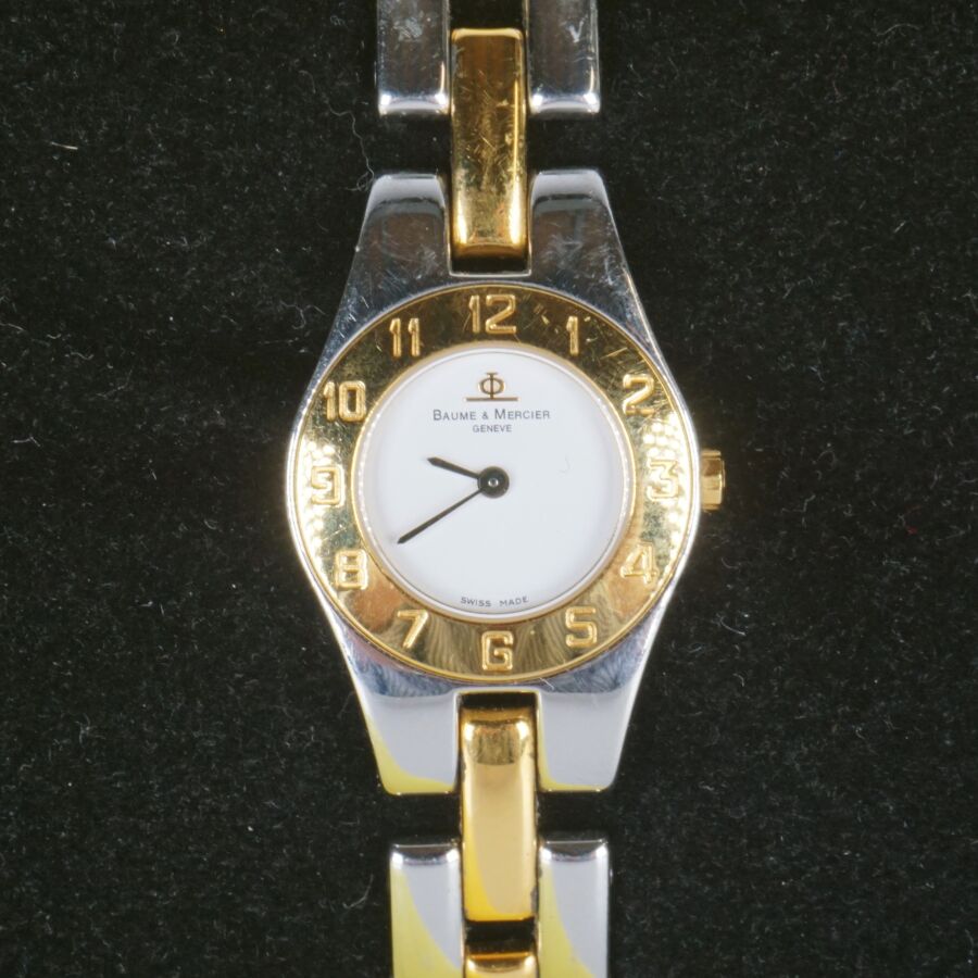BAUME & MERCIER : Montre de dame en acier et métal doré, boîtier de forme tonneau, cadran circulaire, fond blanc signé, chiffres arabes pour les heures présentés sur la lunette externe, fond à clip numéroté, bracelet articulé à boucle double déployante, Diam. Boîtier : 2.2 cm. Poids brut : 47 g environ (présentée sans boîte ni documents, quelques rayures d'usage).