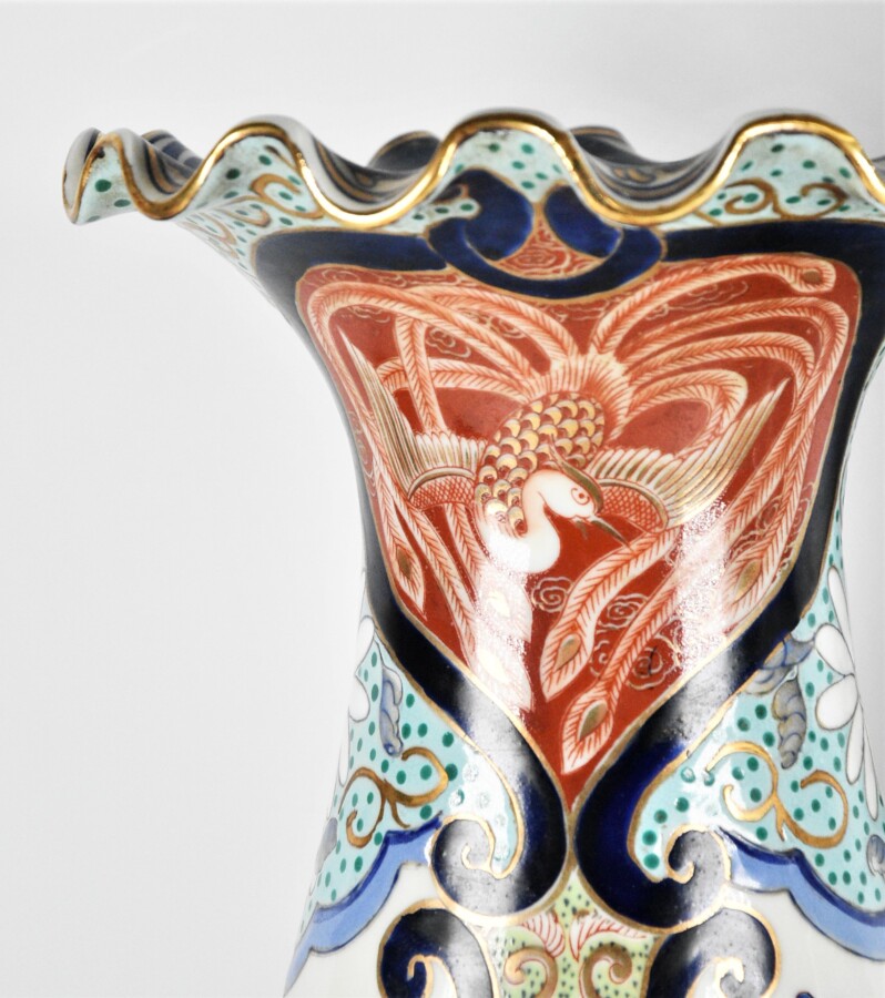 BAYEUX : Paire de vases de forme balustre à col festonné en porcelaine à décor émaillé polychrome de pivoines et de grues, 19e siècle, H. 43 cm (petites usures).