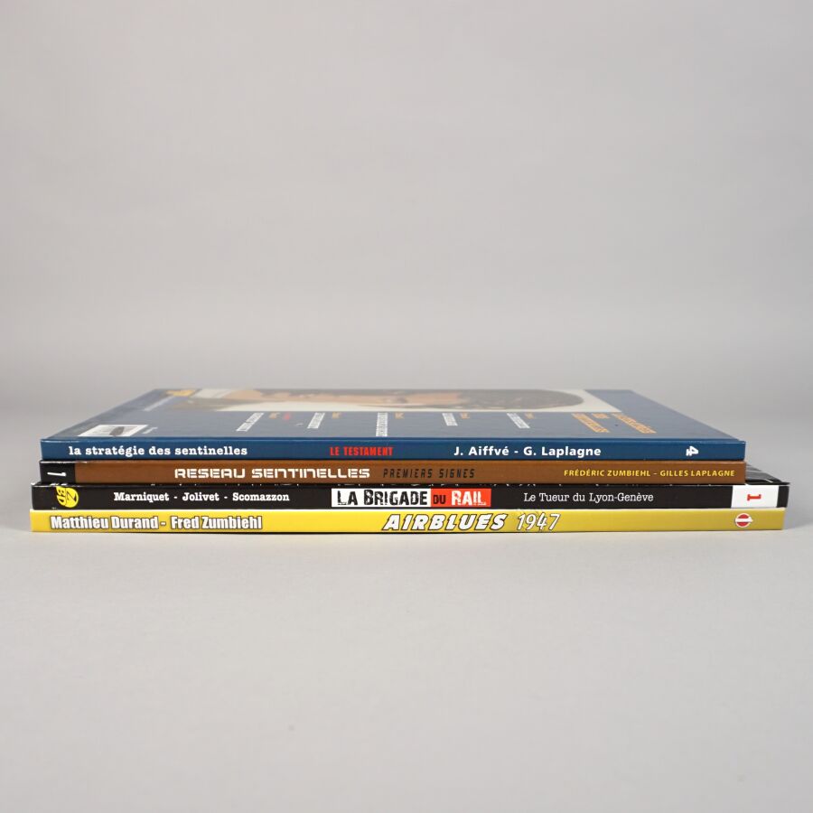 BD DIVERS, éd. ZÉPHYR BD : Ensemble de 4 albums comprenant "La brigade du rail" (tome 1), "Air Blues 1947" (tome 1), "Le réseau sentinelles" (tome 1) et "La stratégie des sentinelles" (tome 4).