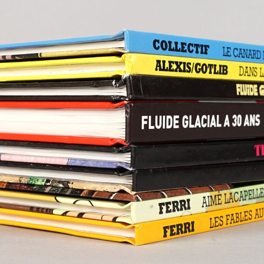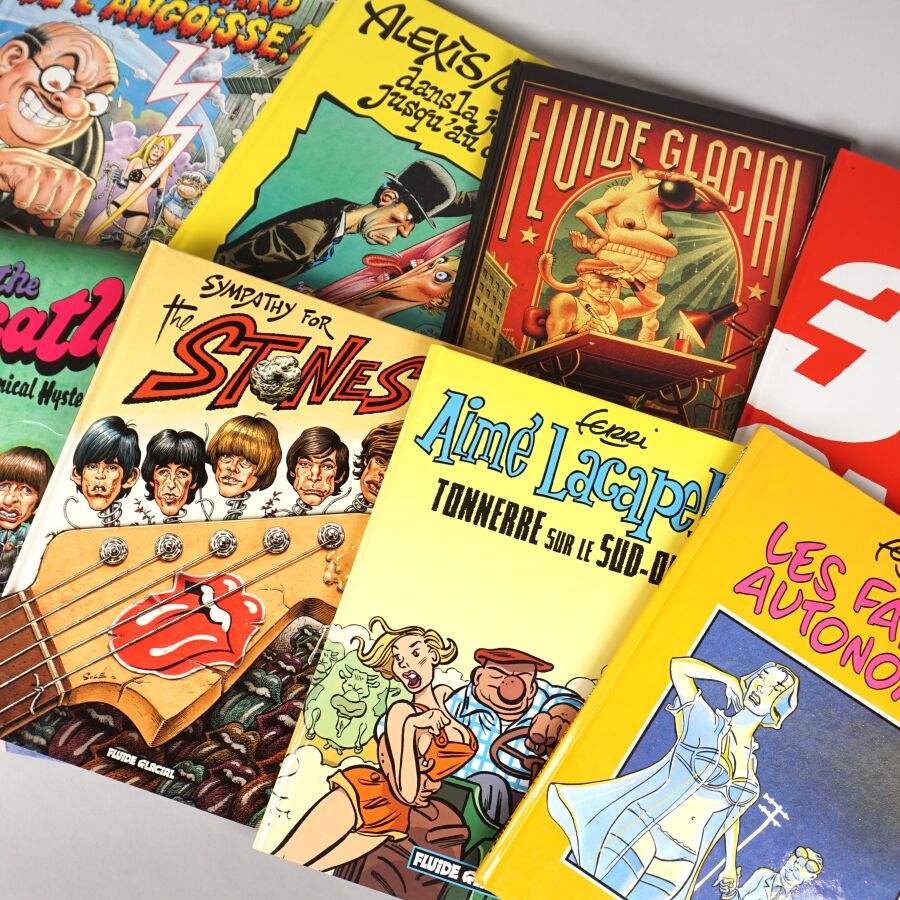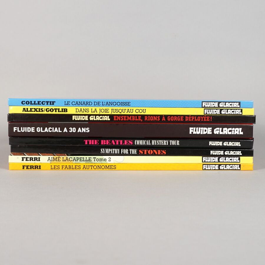 BD HUMOUR, éd. FLUIDE GLACIAL : Ensemble de 8 albums comprenant "Aimé Lacapelle", "Les fables autonomes", "Sympathy for the stones", "The Beattles", "Fluide Glacial a 30 ans", "Ensemble, rions à gorges déployées", "Dans la joie jusqu'au cou" et "Le canard de l'angoisse".