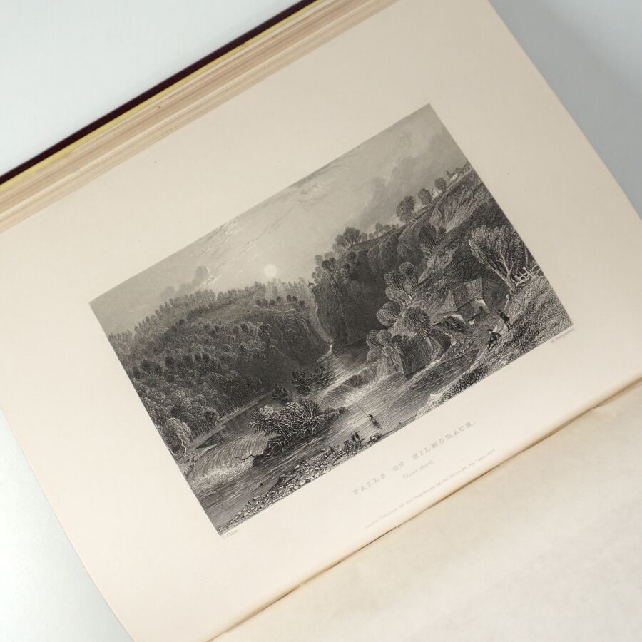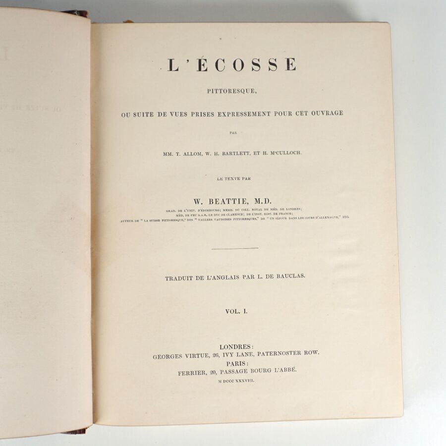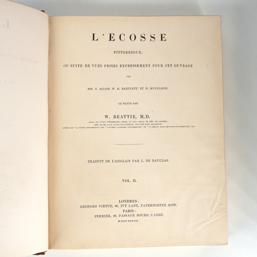 Édition originale française, parue la même année que l'anglaise. Ouvrage illustré de 2 titres gravés ornés chacun d'une vignette, d'une carte dépliante de l'Écosse et de 117 planches hors texte gravées sur acier d'après les dessins de Allom, Bartlett et McCulloch. Texte traduit de l'anglais par L. de Bauclas.