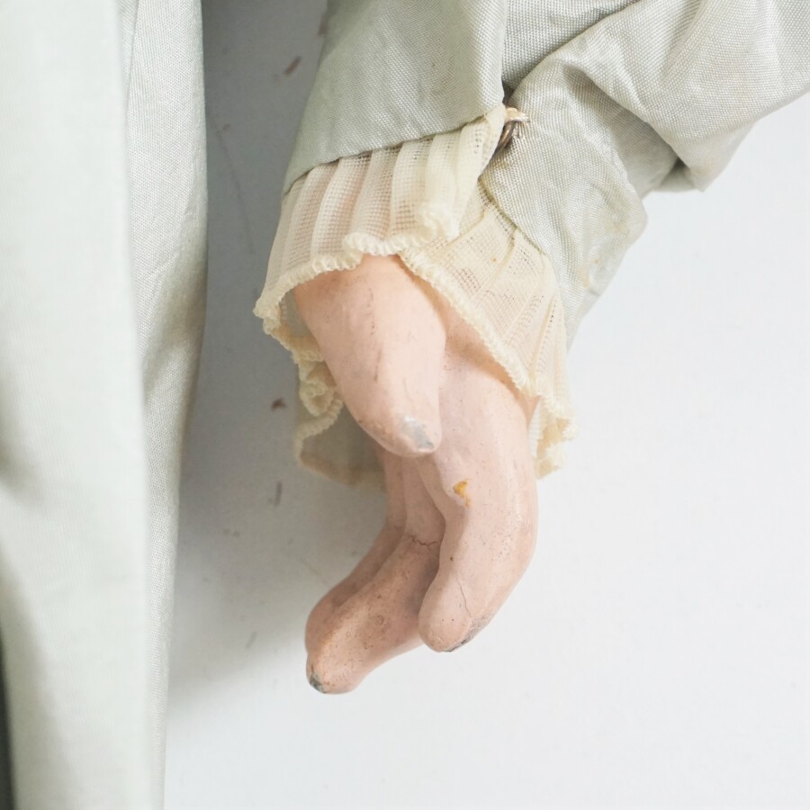 Bébé Jumeau, marqué "C.X", tête biscuit, bouche fermée, yeux fixes bleus clairs, oreilles percées, corps à boule, sous-vêtements d'époque, H. 57 cm (manque une chaussure, taches à la robe, petites usures à la main gauche et perruque collée).