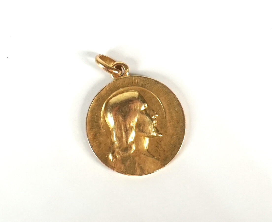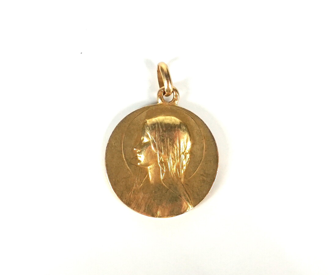 Belle médaille religieuse en or jaune 18K (750/oo), à décor en léger bas-relief de la Vierge Marie sur une face et du Christ sur l'autre face, D. 2.5 cm, H. 3.4 cm. Poids brut : 11.6 g environ.