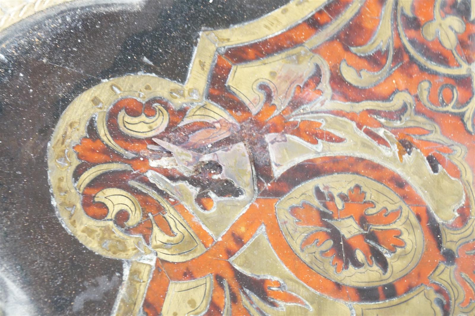 Belle table de milieu de forme violonée en marqueterie dans le goût de Boulle, quatre pieds galbés, chutes ornées de bustes féminins en bronze doré, un tiroir en ceinture, plateau à riche décor de marqueterie protégé par un verre. Epoque Napoléon III, H. 76 cm., 130 x 74 cm. (sans clé, accidents).