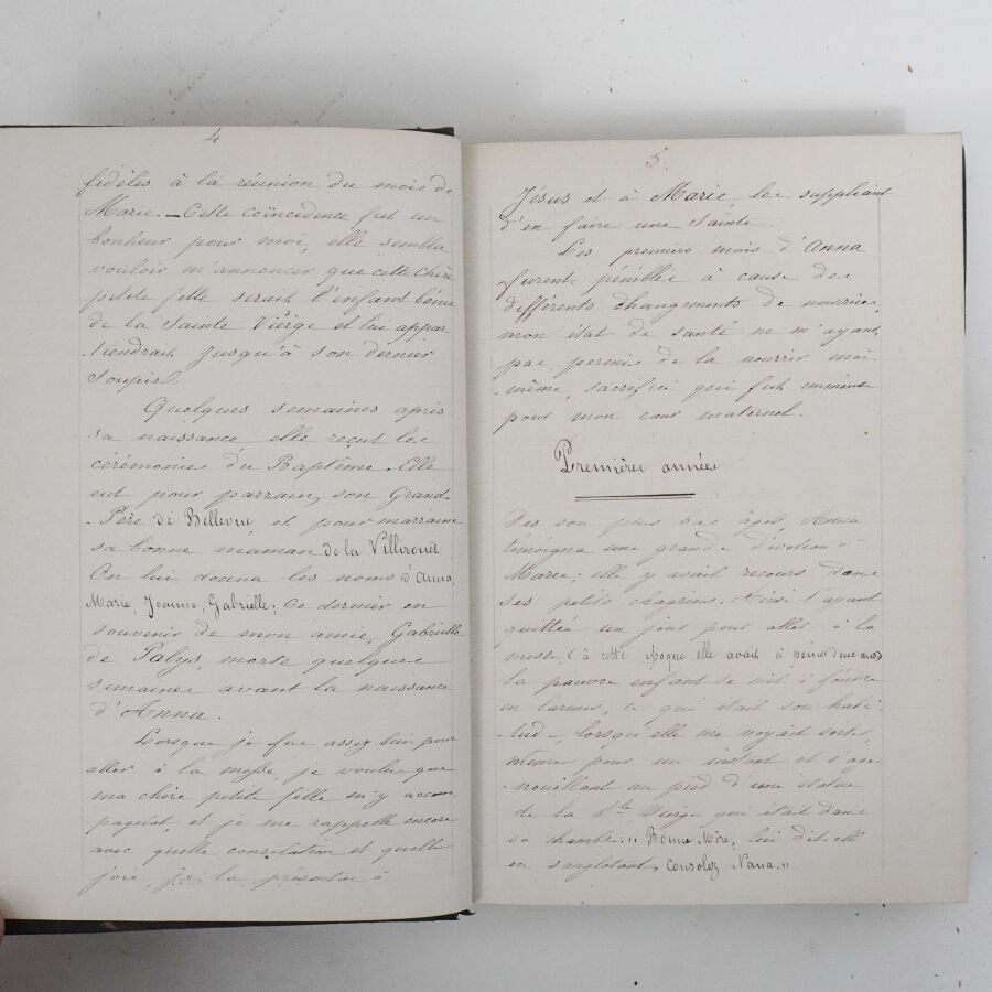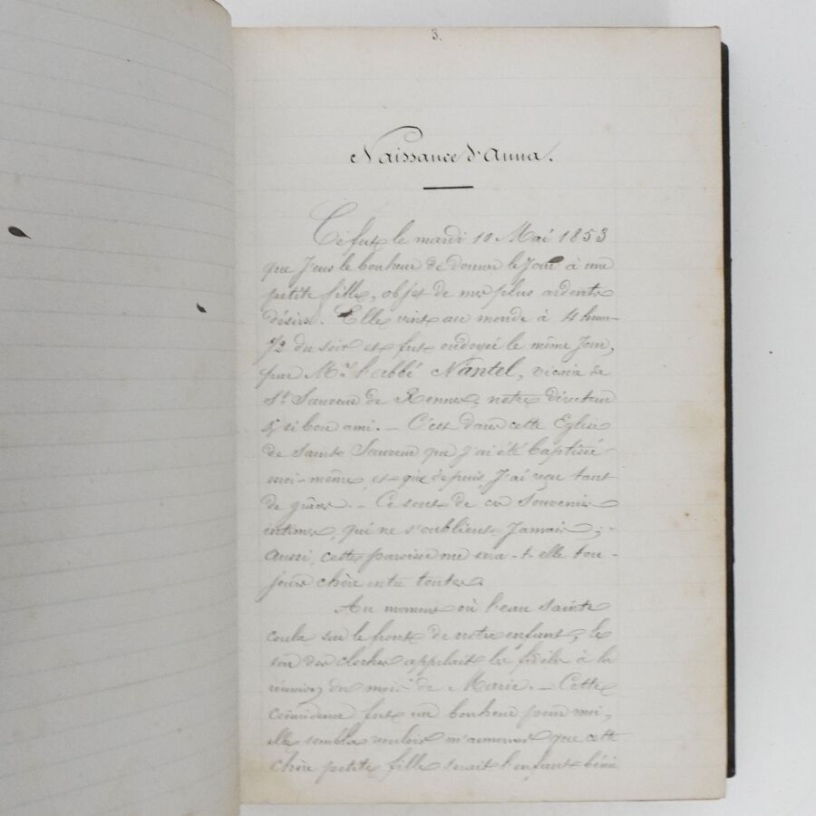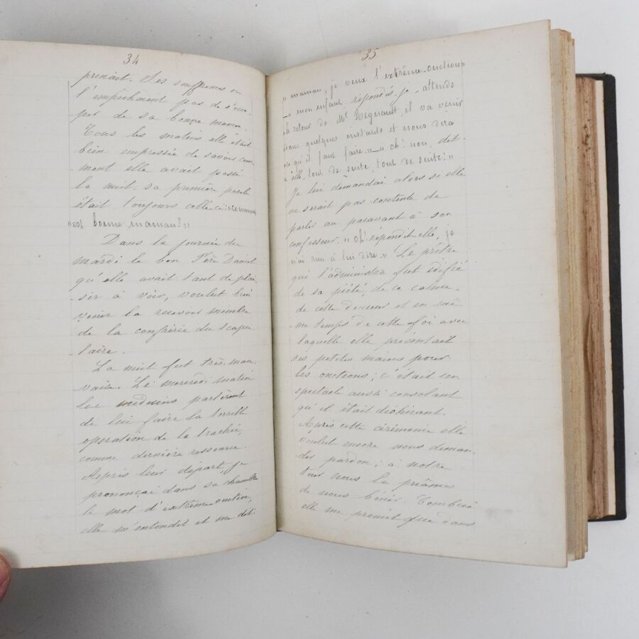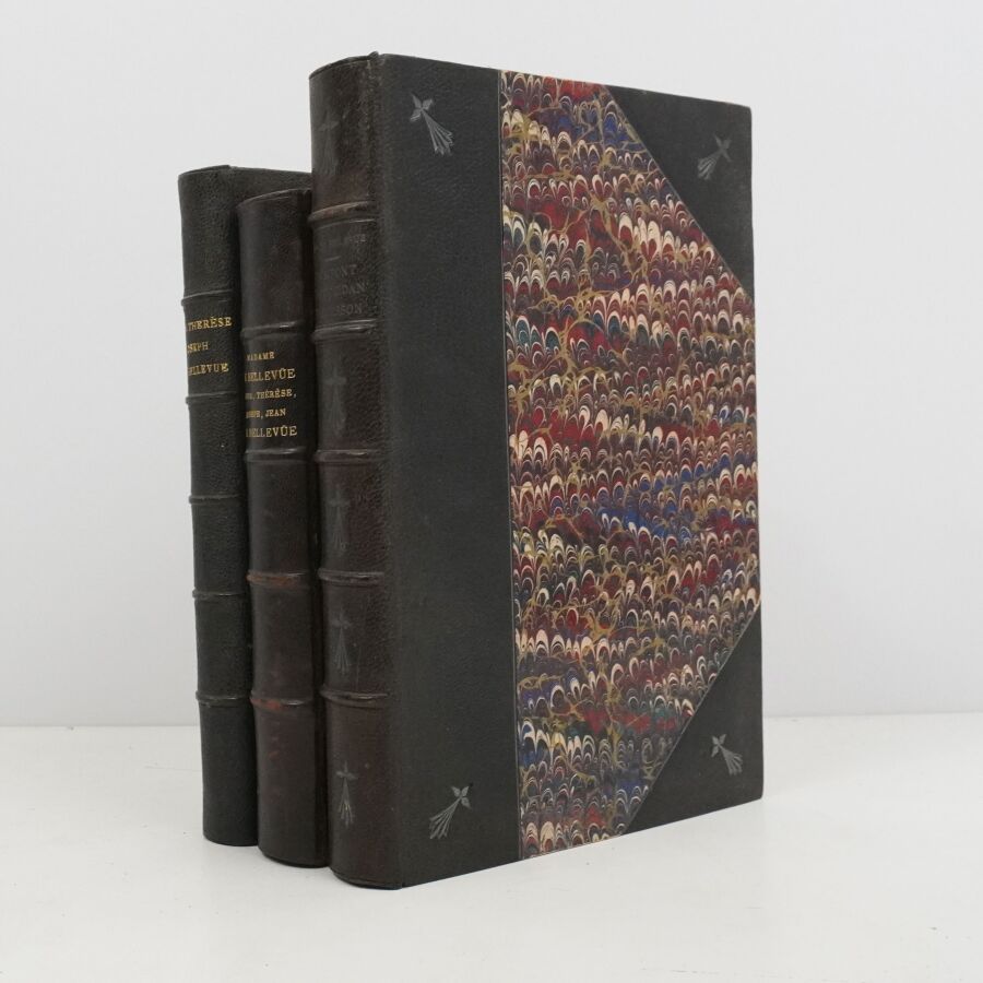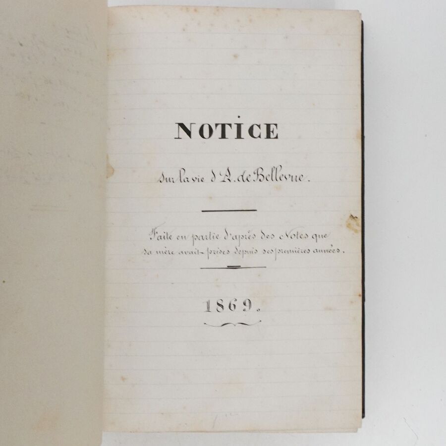 On y joint : Madame de BELLEVÜE. Notice sur la vie d'A. de Bellevue, faite en partie d'après les notes que sa mère avait prises depuis ses premières années, 1869. 2 vol. manuscrits, in-8, demi-chagrin à coins, dos à nerfs, titre doré (reliure de l'époque). Suivie de : Notice sur la vie et la mort de Thérèse de Bellevue, 1872 ; Quelques détails sur la vie et la mort de Joseph de Bellevüe, décédé à nantes le 4 août 1881 à l'âge de 22 ans 10 mois ; Jean ! 1861-1904. Le second volume est une copie des 99 premières pp. de la première notice.