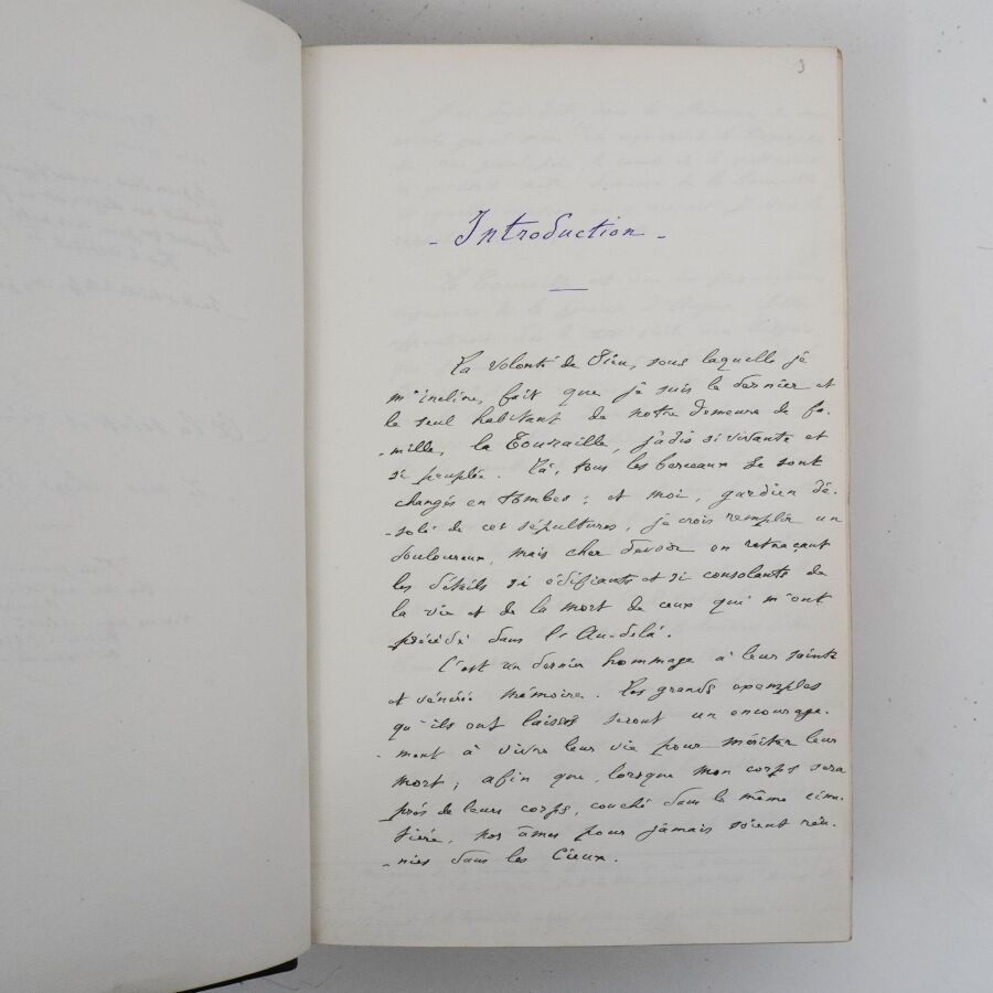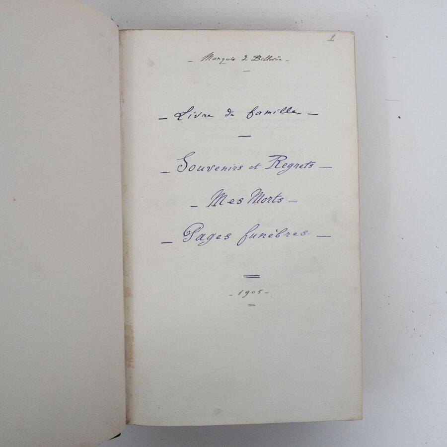 BELLEVÜE (Xavier, comte de). Livre de famille. Souvenirs et Regrets. Mes Morts. Pages funèbres. sl, , 1905. Fort in-folio de 523 pp. MANUSCRITES ch., demi-chagrin noir à coins, dos à nerfs.