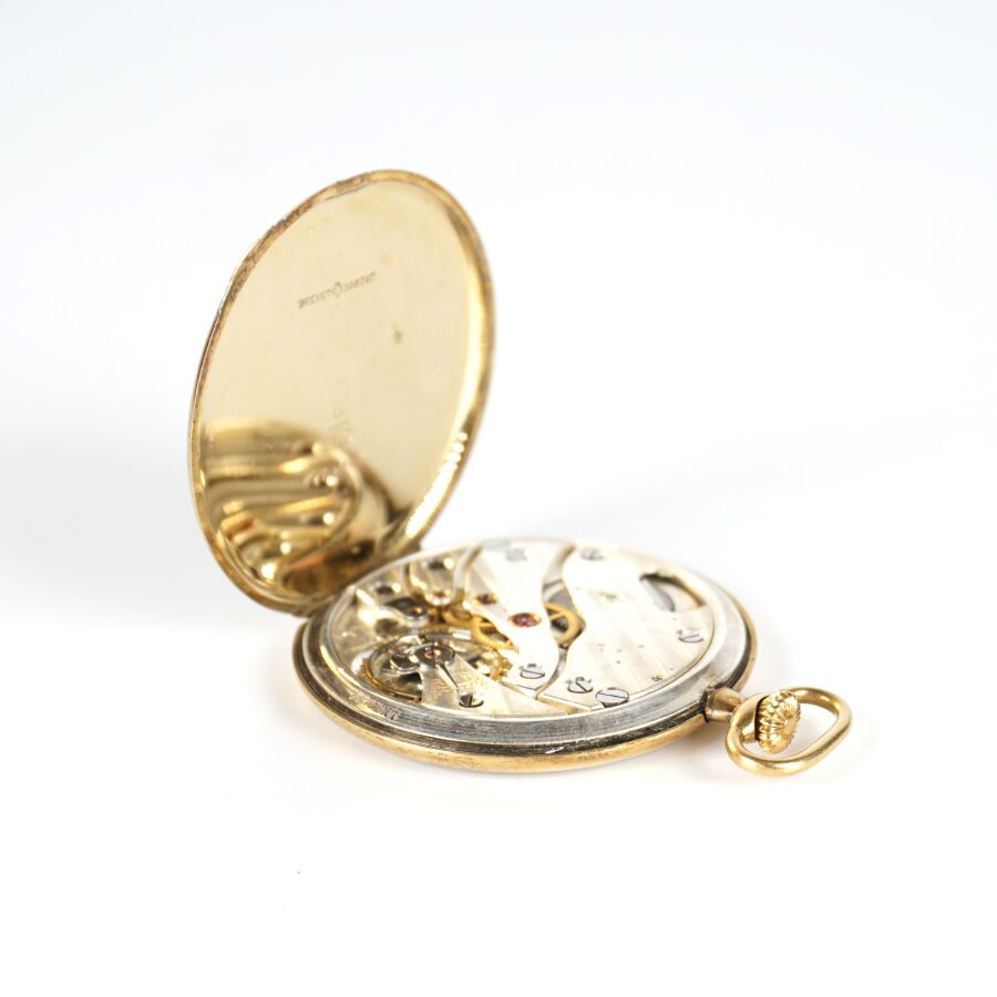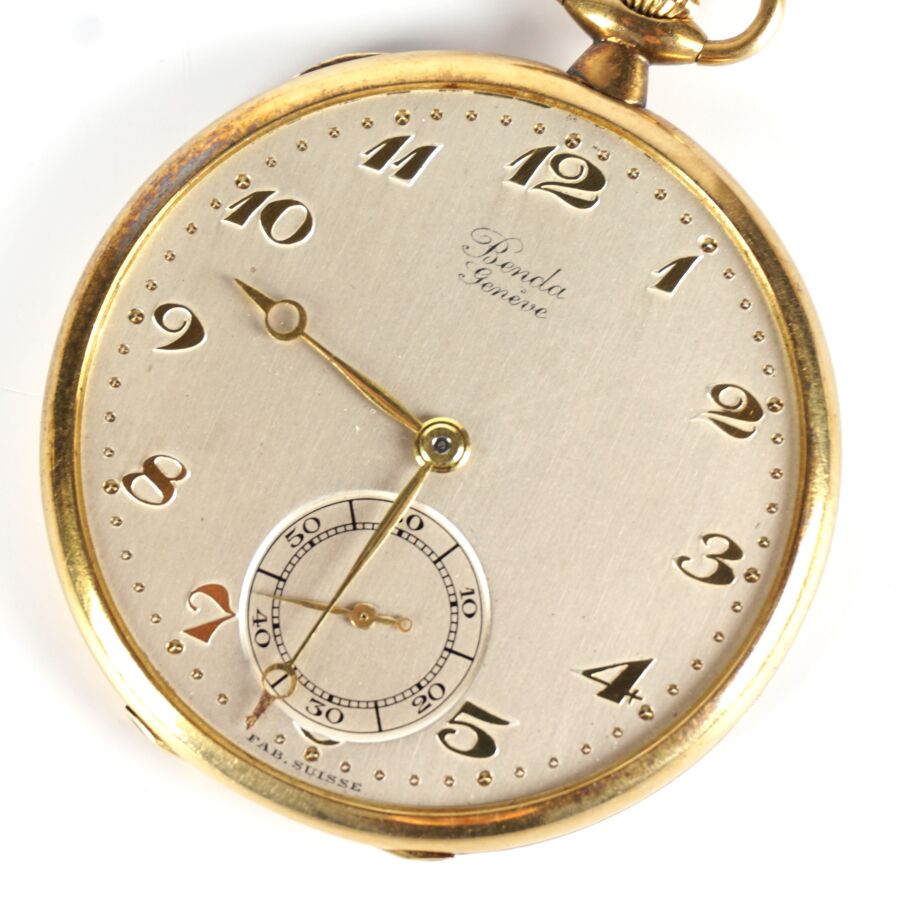 BENDA GENEVE : Montre de poche en or jaune 18K (750/oo), cadran argenté signé (sans verre), chiffres arabes pour les heures et cadran des secondes à 6H, revers du boîtier à motif de damier, mouvement en argent (925/oo), Diam. Boîtier : 4.4 cm. H. Avec bélière : 5.5 cm. Poids brut : 40.6 g environ (usures).
