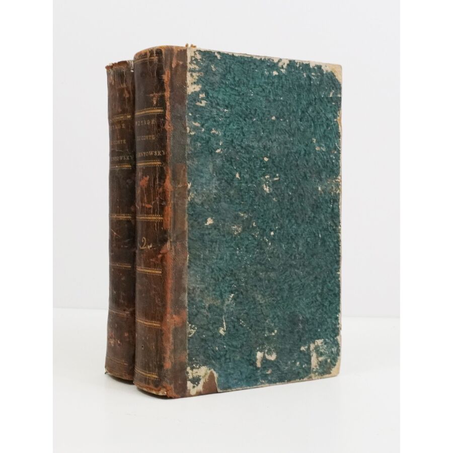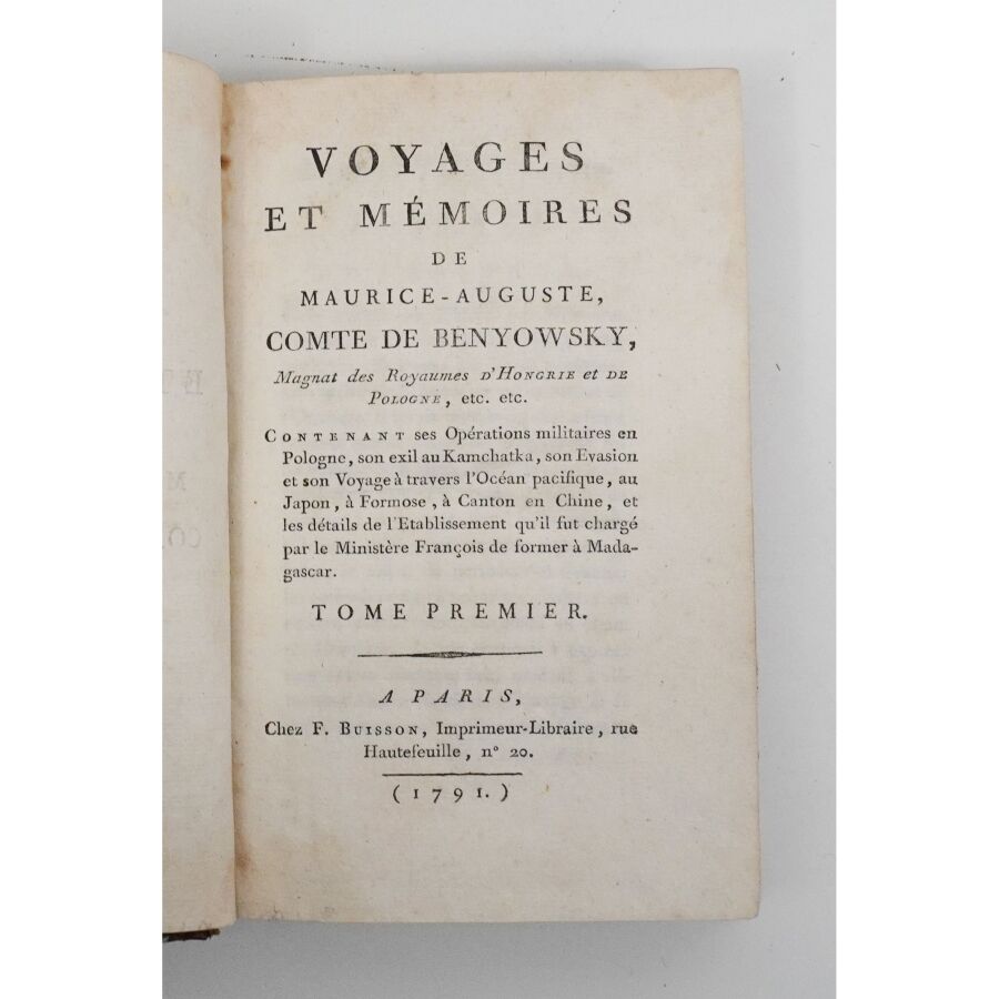 BENIOWSKY (Maurice-Auguste, comte de). Voyages et mémoires de Maurice-Auguste, comte de Benyowsky, magnat des royaumes d'Hongrie et de Pologne, Contenant ses Opérations militaires en Pologne, son Exil au Kamtchatka, son Evasion et son Voyage à travers l'Océan Pacifique, au Japon, à Formose, à Canton en Chine et des détails de l'Etablissement qu'il fut chargé par le Ministère françois de former à Madagascar . Paris, Buisson, 1791. 2 vol. in-8, demi-veau, dos lisses ornés (reliure de l'époque). Reliures usagées avec manques de cuir.