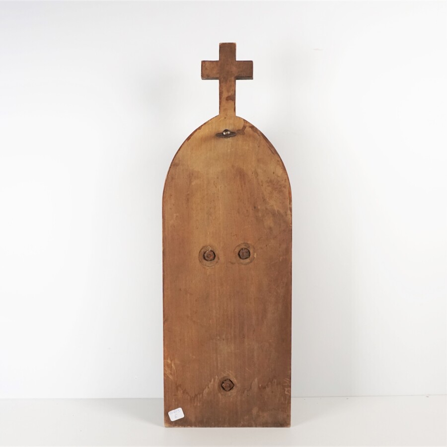 Bénitier en applique, la partie haute figurant Sainte-Anne accompagnée de Marie, bronze à patine médaille, montée sur console, la partie basse retenant le bénitier en forme de coquillage, fin du 19ème siècle, H. Totale : 59 cm. Sujet Sainte-Anne : 34 cm.